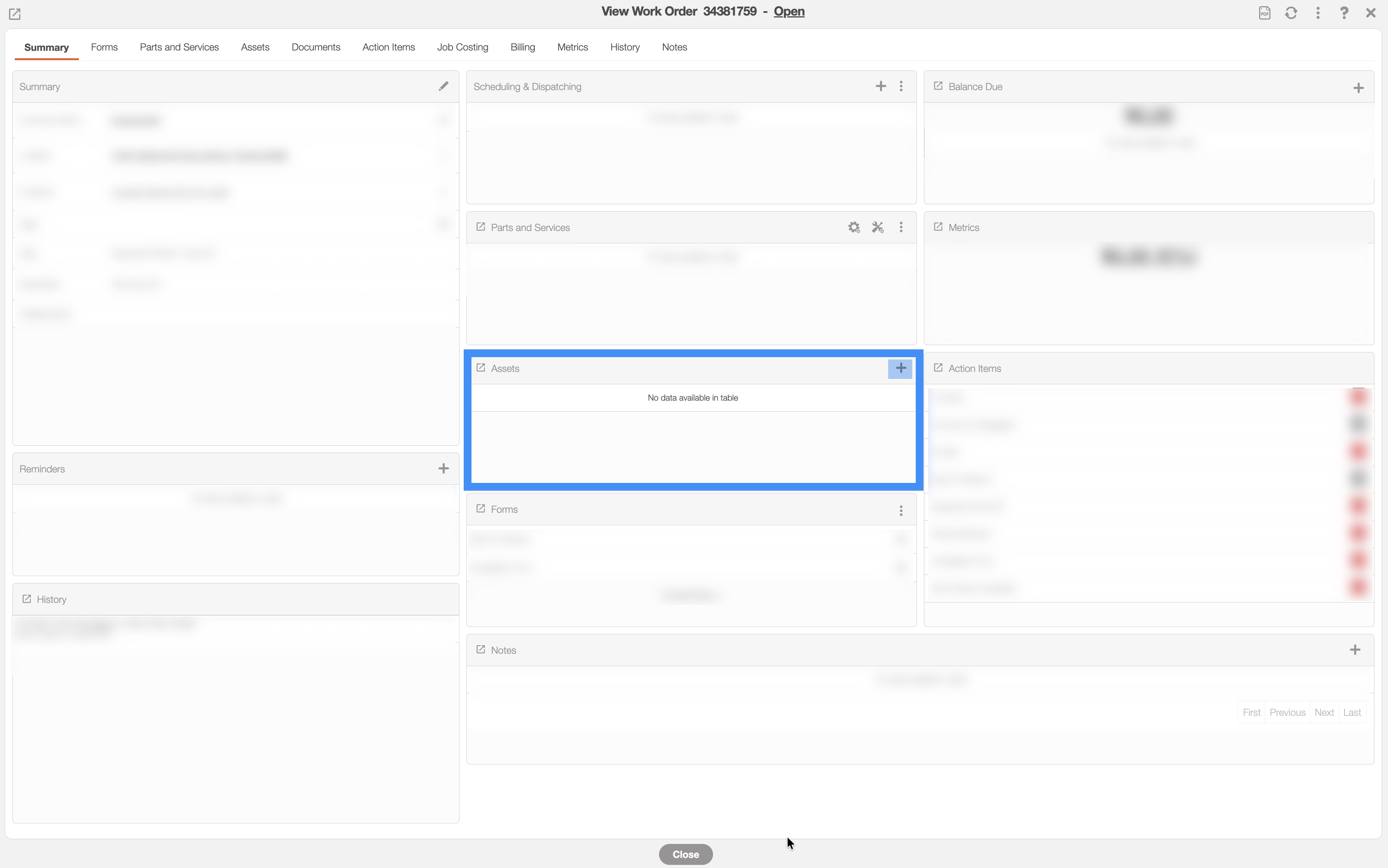Once the work order is created, navigate to the "Asset" panel and click the Plus Sign icon: