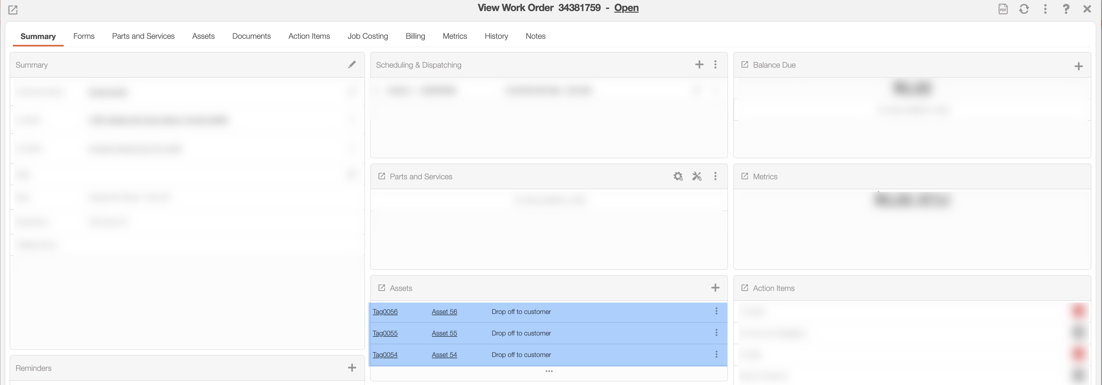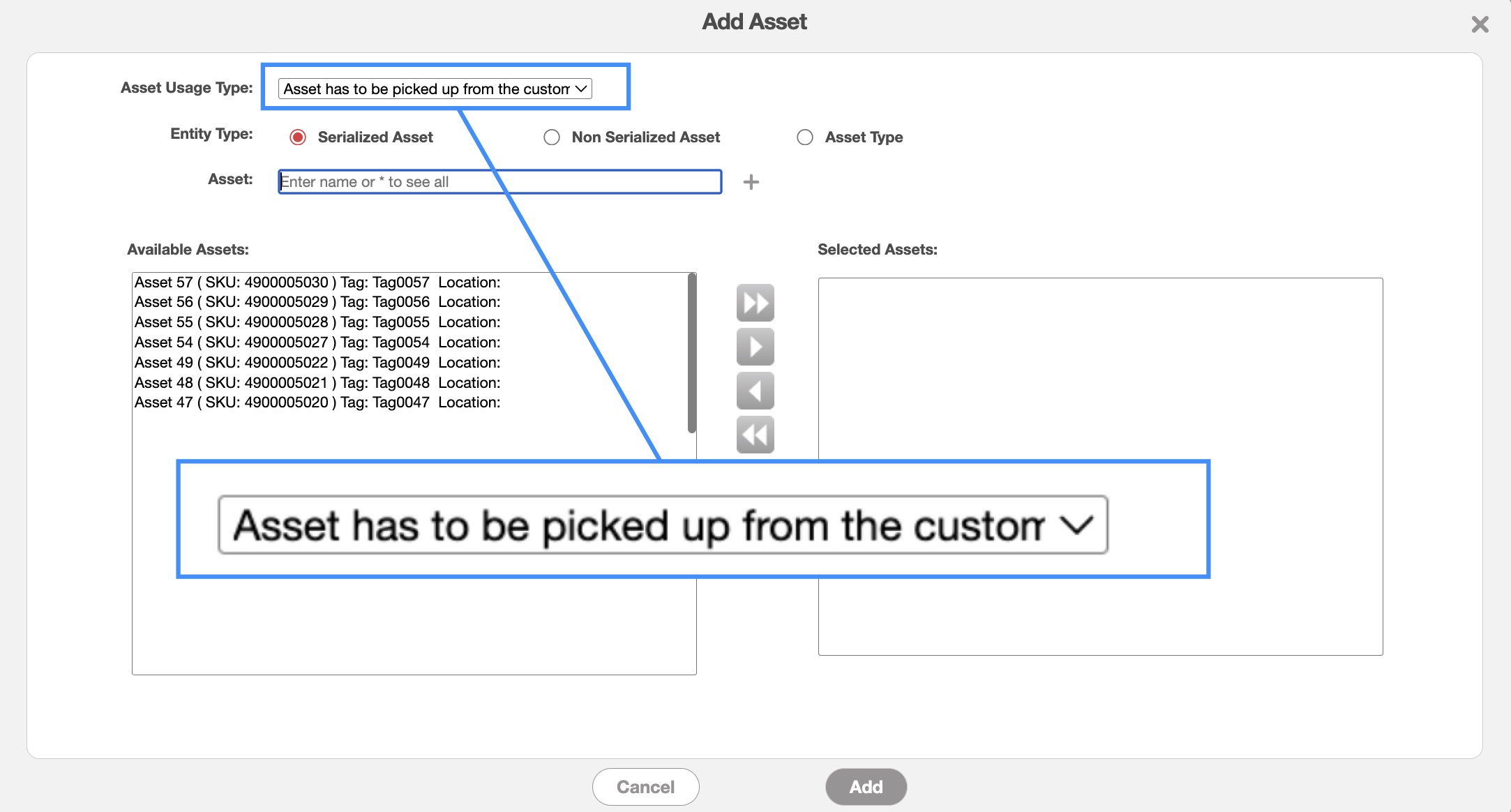 This step is optional, particularly when picking up all assets. If no specific asset is selected, the driver or technician will see the full list of assets at the customer location and can choose which ones to pick up or select all of them.