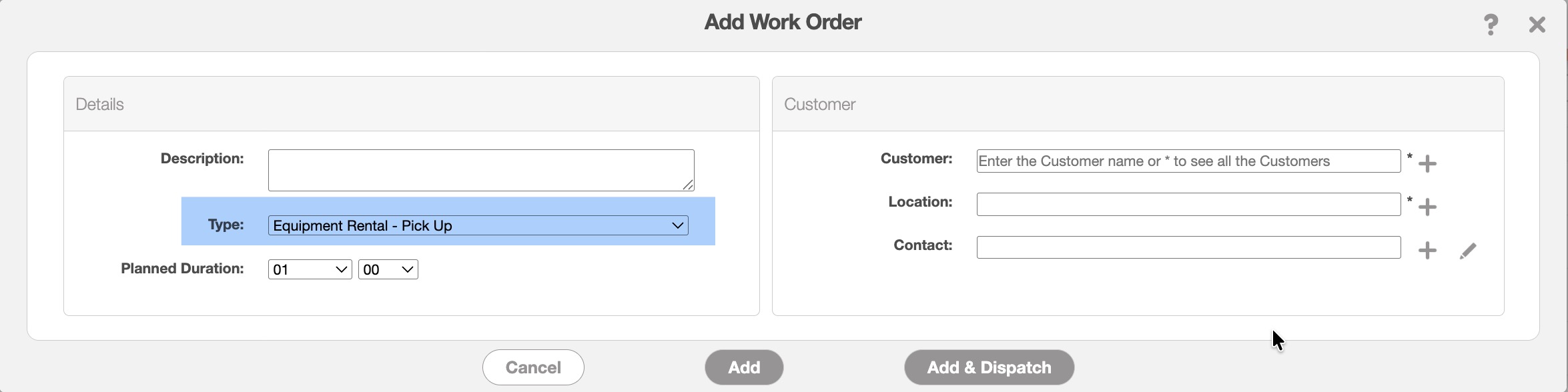 Step 1: Create an "Equipment Rental - Pick Up" Work Order