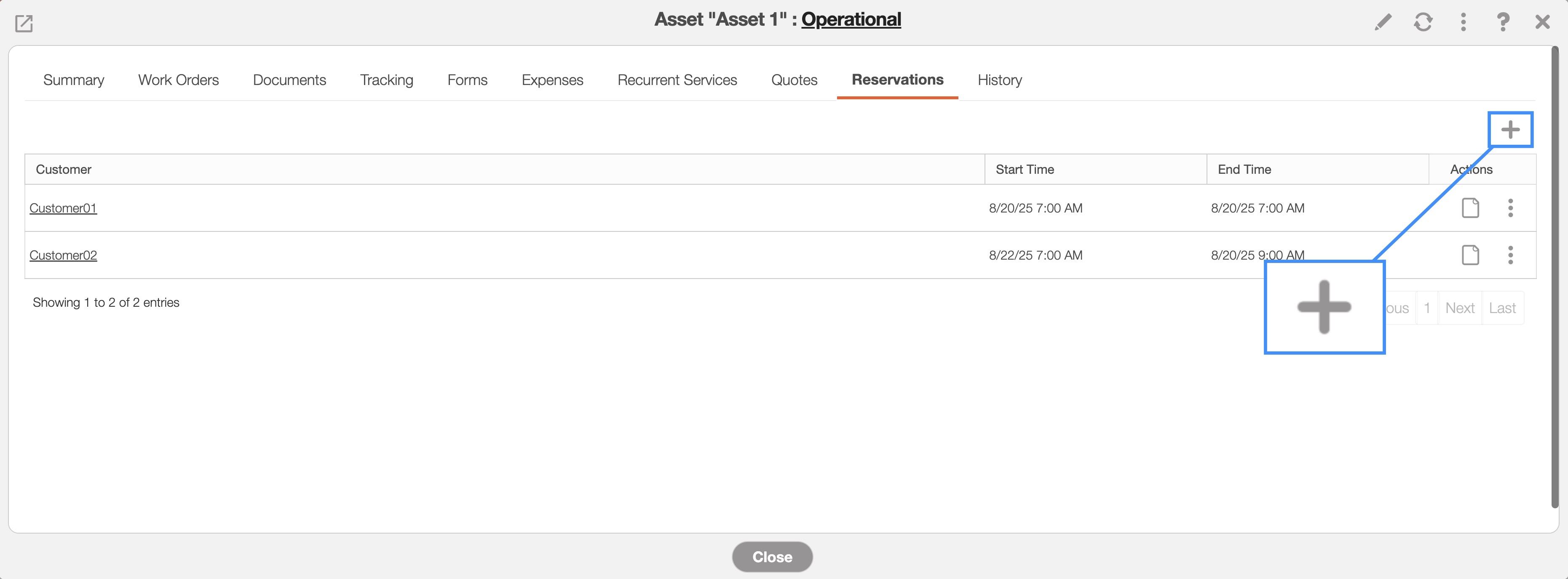 In the View Asset pop-up window, you can reserve assets for specific customers and locations. This is especially ideal when an asset needs to be reserved for a work order or project.
