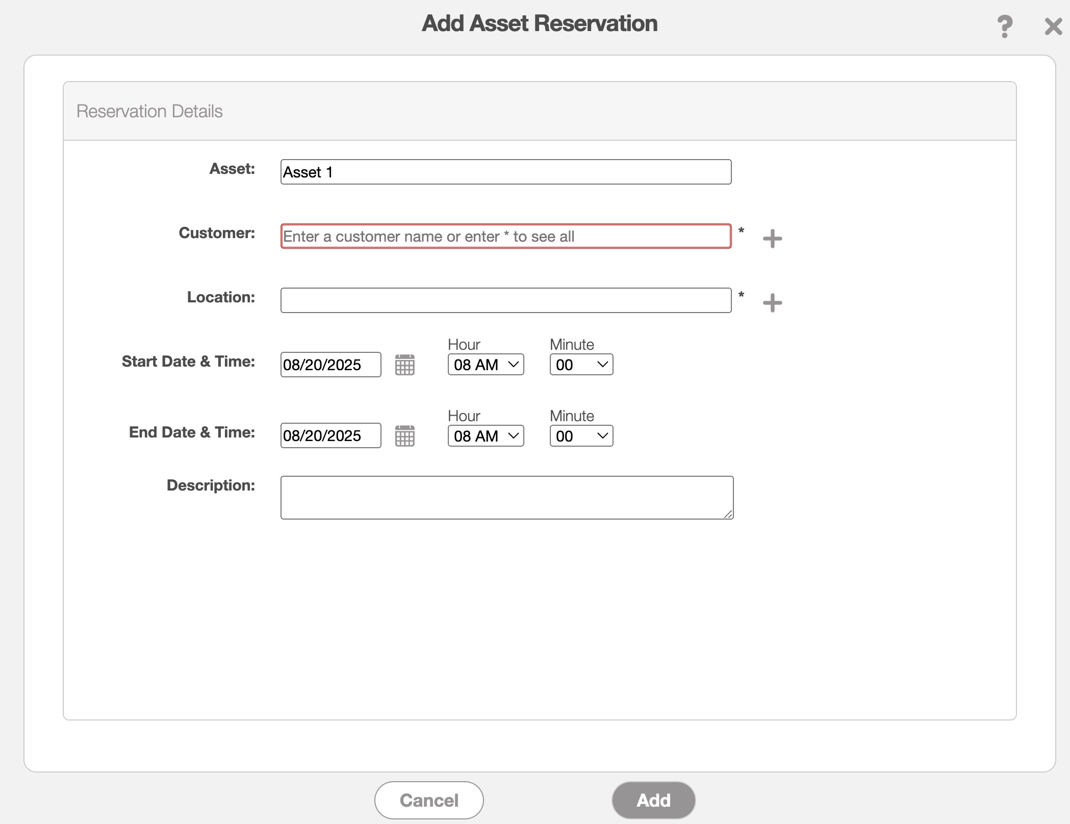 In the Add Asset Reservation enter the following information to complete the reservation:
