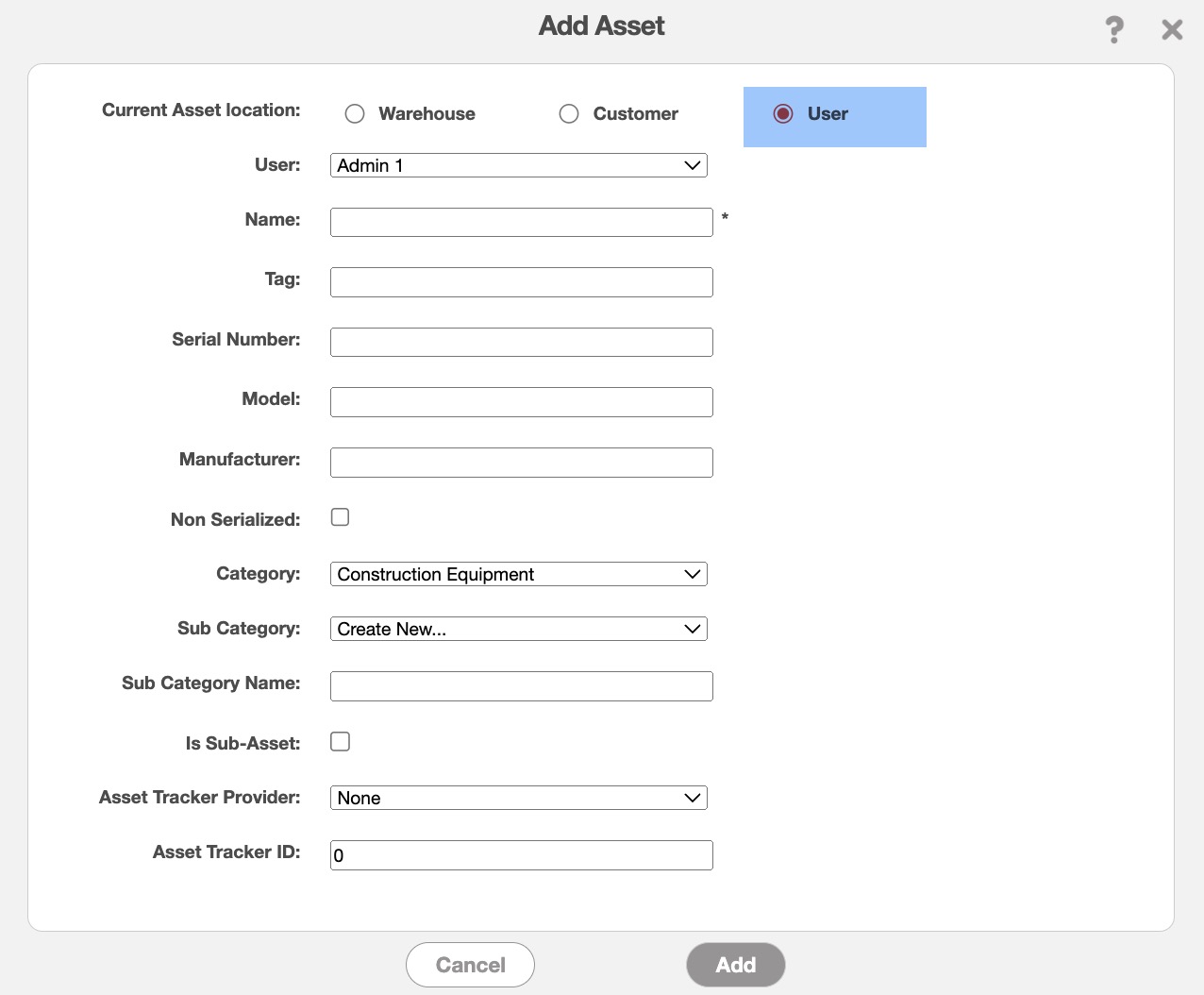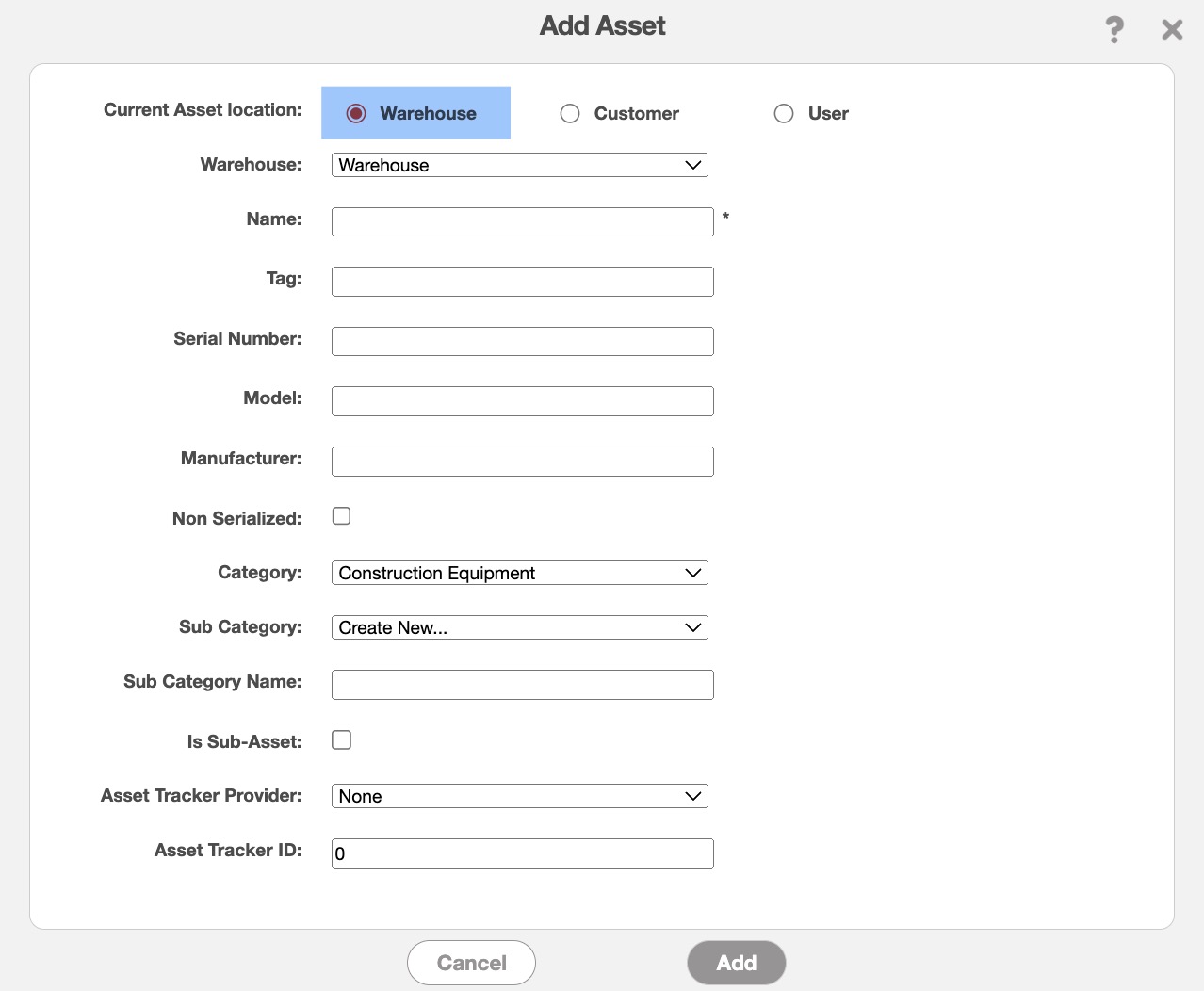 Regardless of the method that you choose to add an asset, the Add Asset pop-up window will appear. From this window you will be able to input the serial number, the name of the asset, the manufacturer, and more: