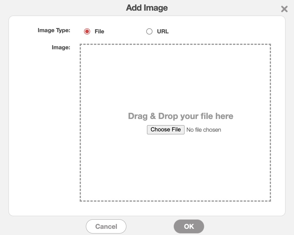 The Add Image pop-up window will then appear. Upload the desired image by drag & dropping the file, searching your computer for the image, or inserting the URL of the image. Once you are satisfied, click the Ok button: