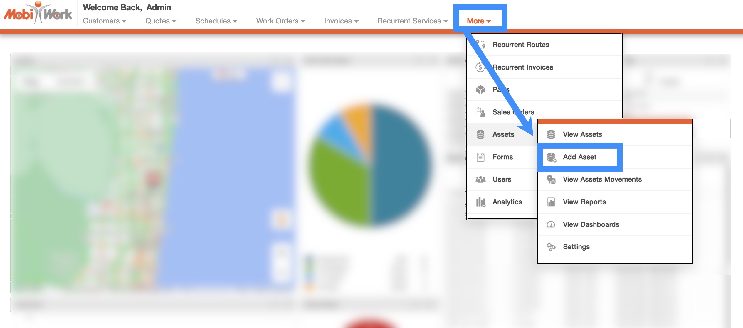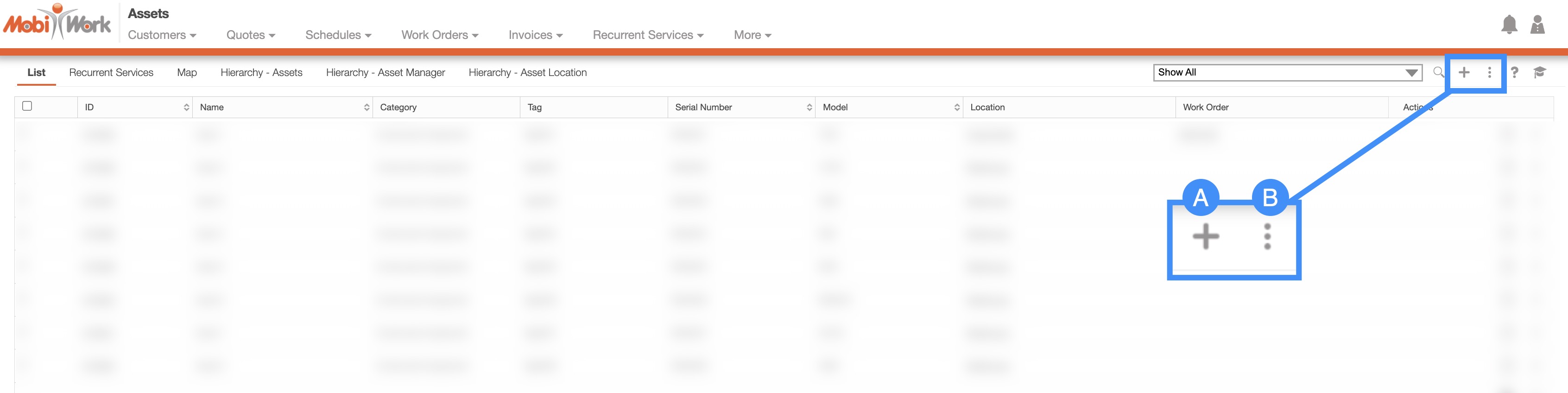 The fastest and easiest way to add a new asset is by accessing the drop-down menu from the Assets feature located in your MobiWork menu: