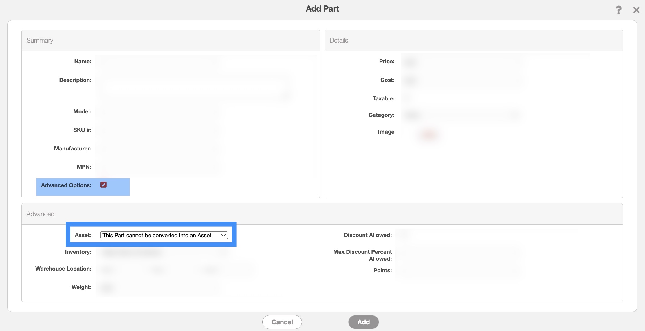 When adding a new part or editing a part, you will be able to indicate if the selected part should be converted into an asset. This can be done in the Add Part or Edit Part pop-up window. To access this aspect of the Add Part or Edit Part pop-up window, you first must click the "Advanced Options" checkbox.