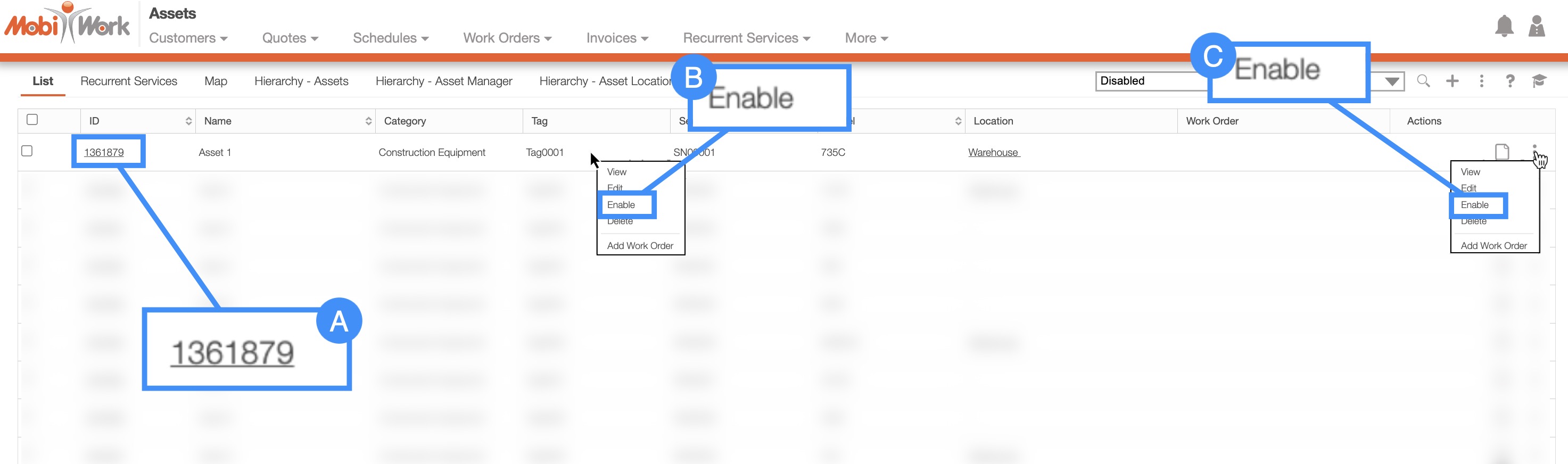 Within MobiWork, you have the option to re-enable a previously disabled asset or add an entirely new one. The subsections below will elaborate on the various methods for adding a new asset, converting a part into an asset, or enabling asset.
