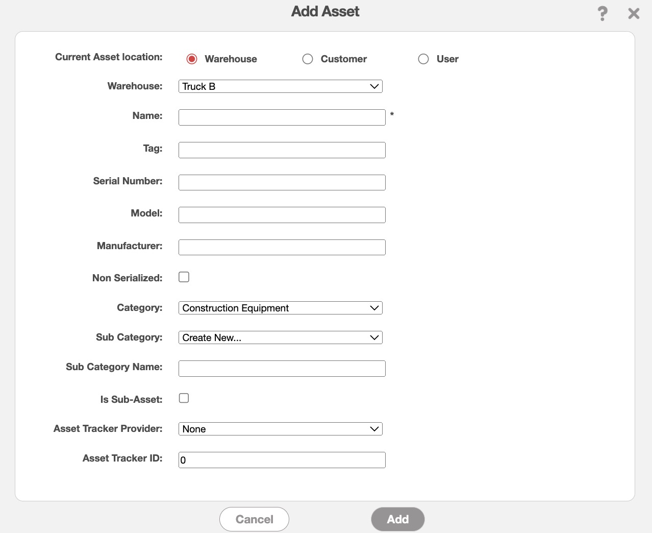 When selecting a new current asset location, the data requested from the Add Asset pop-up window changes slightly. The following images illustrate how the Add Asset pop-up window changes when the current asset location is updated.
