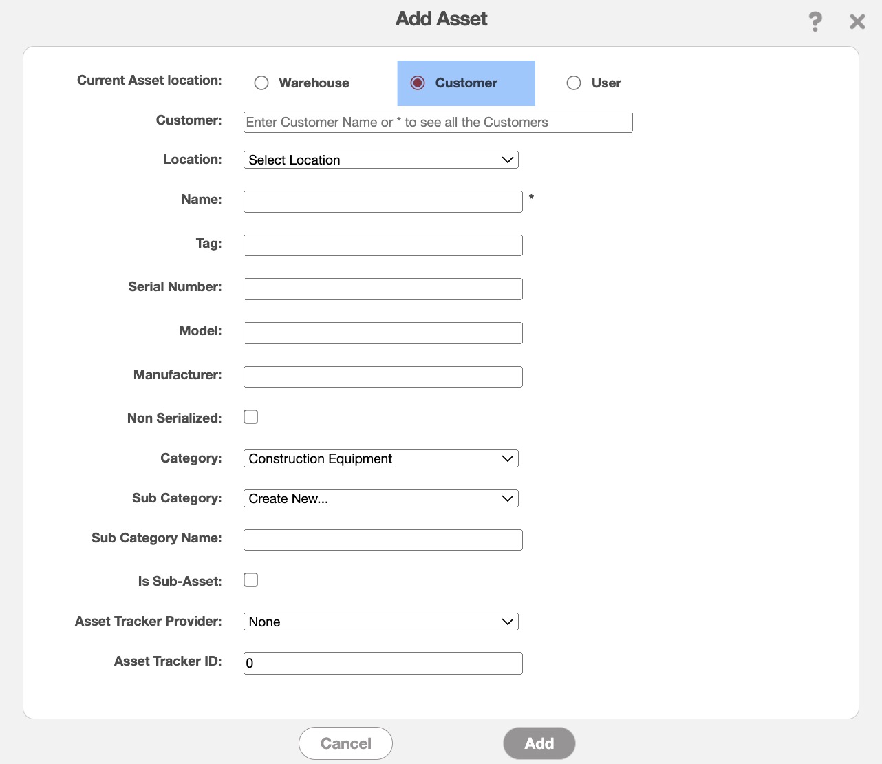 | "Current Asset Location" | Select the current location where the asset is stored (e.g., Warehouse, Customer, or User) |