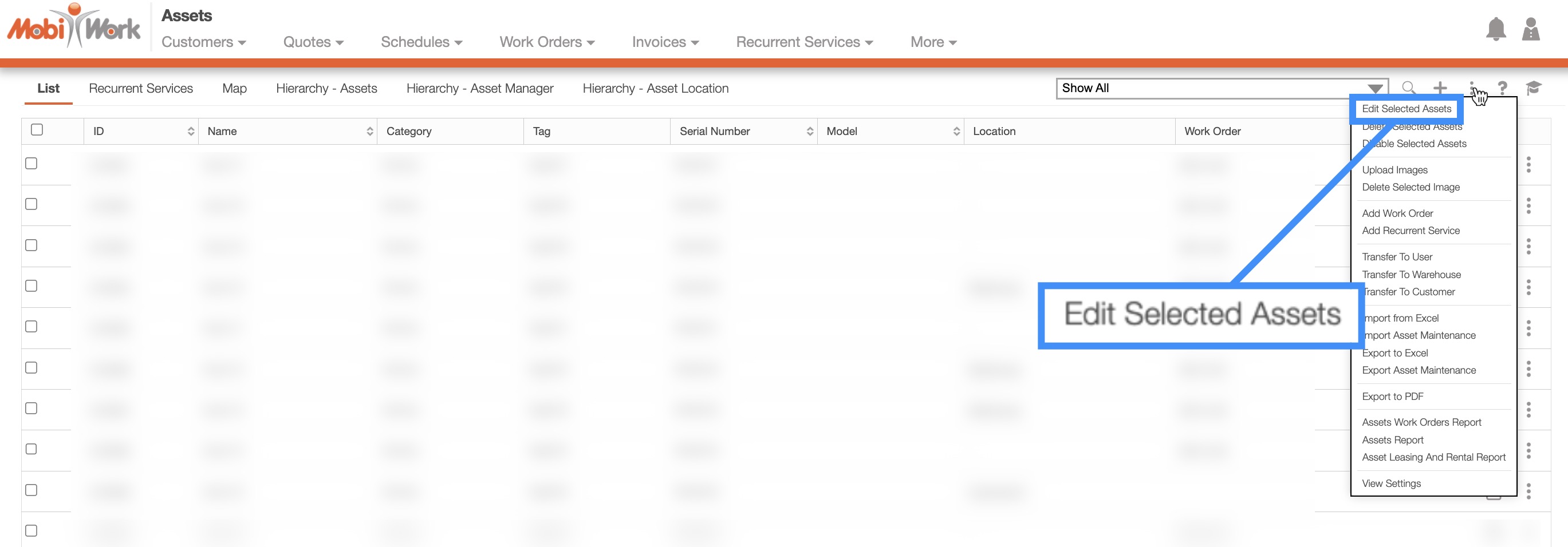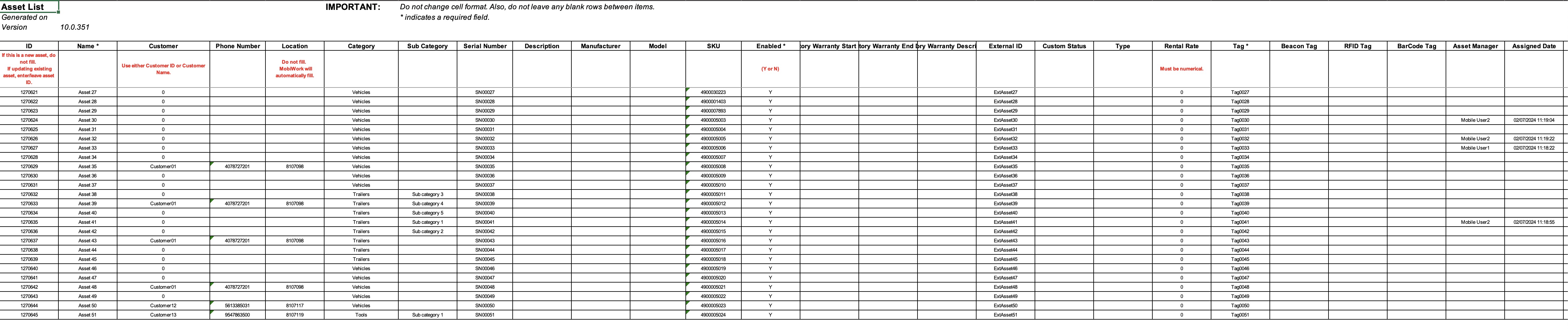 MobiWork allows you to edit multiple assets in two different ways. Within MobiWork you can edit the value of multiple assets at once or you can import an Excel file with the changes.