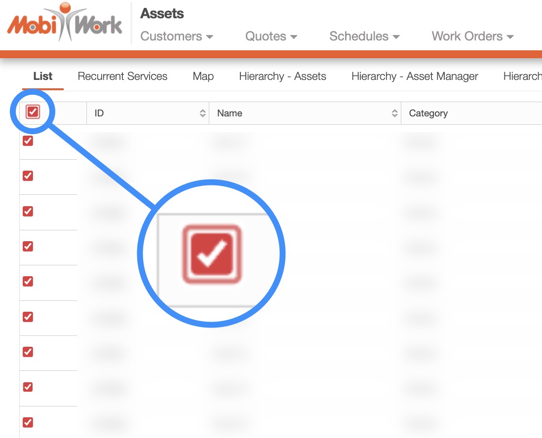 Check off the desired assets you would like to edit; if you would like to edit all your assets you can click on the topmost checkbox (Multiple Selection Area) located in the Assets feature page column: