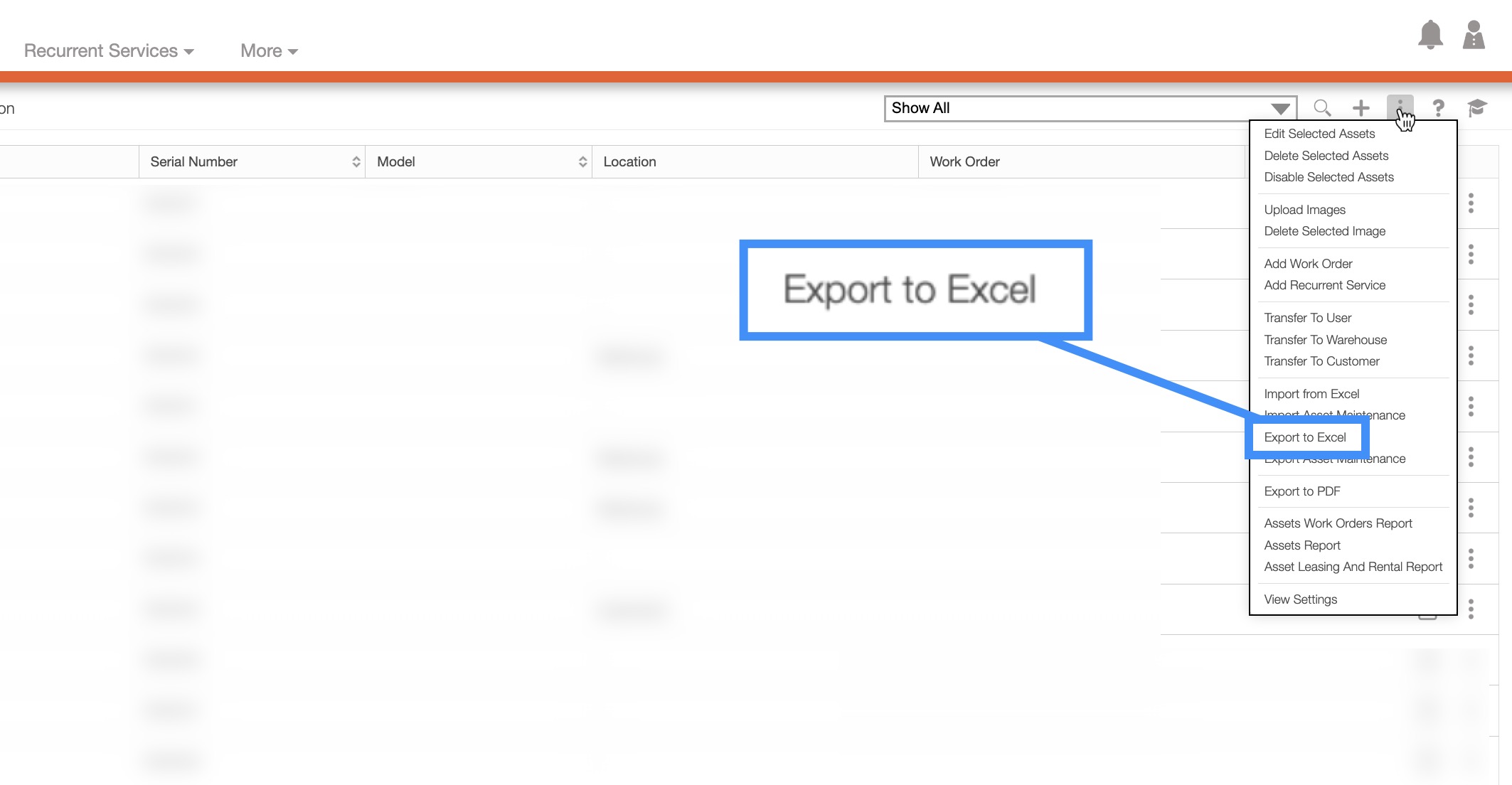 This export will display the basic asset data (e.g., Asset name, the customer information of the customer who has the asset, the manufacturer, the serial number, etc.) in an easy-to-read format. You can then use Excel to easily navigate through your company's assets: