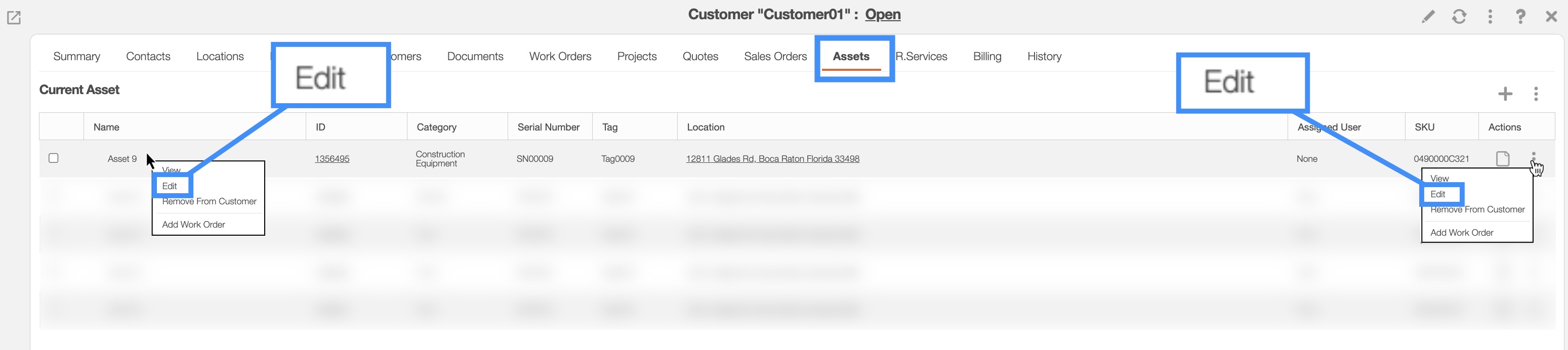 There are several ways you can edit an asset within MobiWork. You can edit the asset through the View Work Order pop-up window, the View Customer pop-up window, and through the Assets feature page.