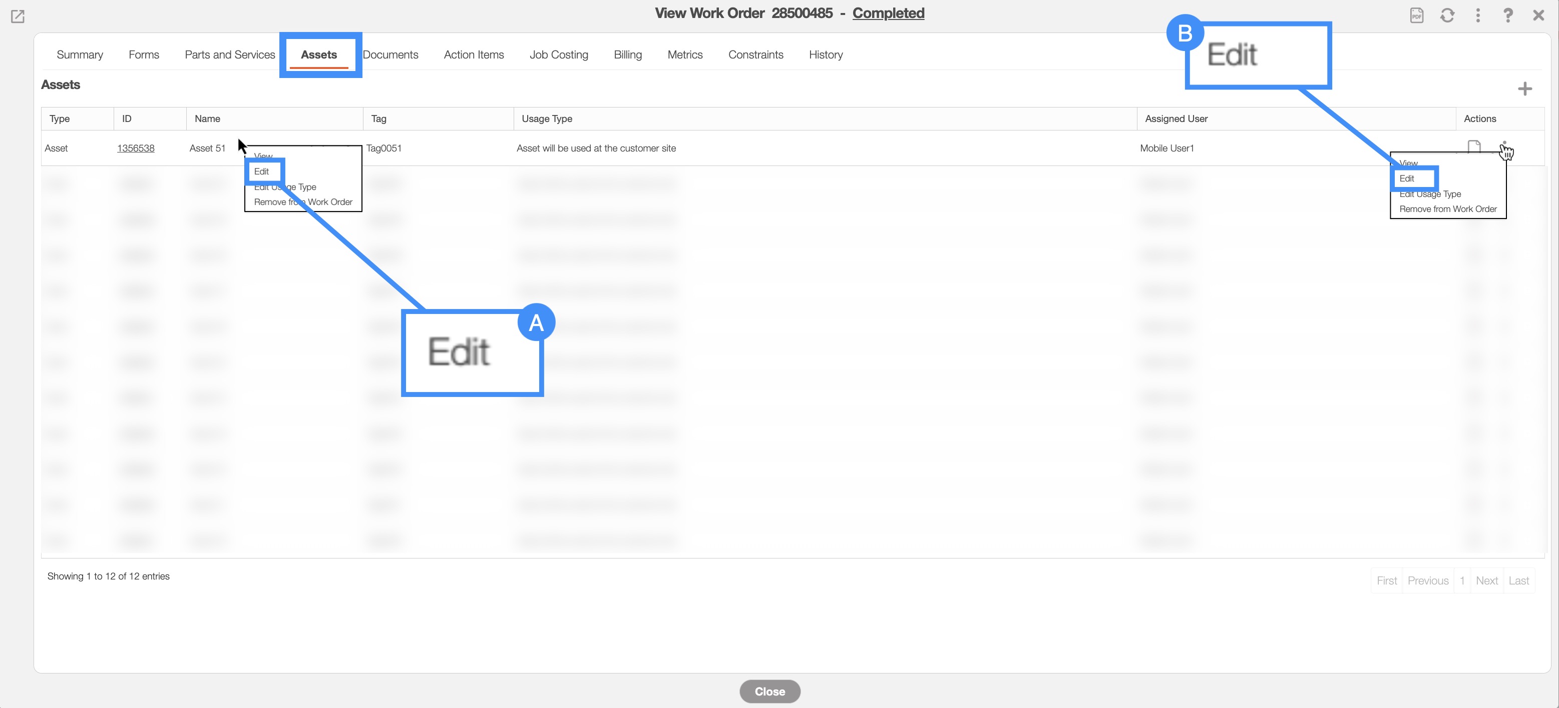 Once you open the View Work Orders pop-up window select the "Assets" tab. On the "Assets" tab click on the Individual Actions button and from the drop-down select the "Edit" option:
