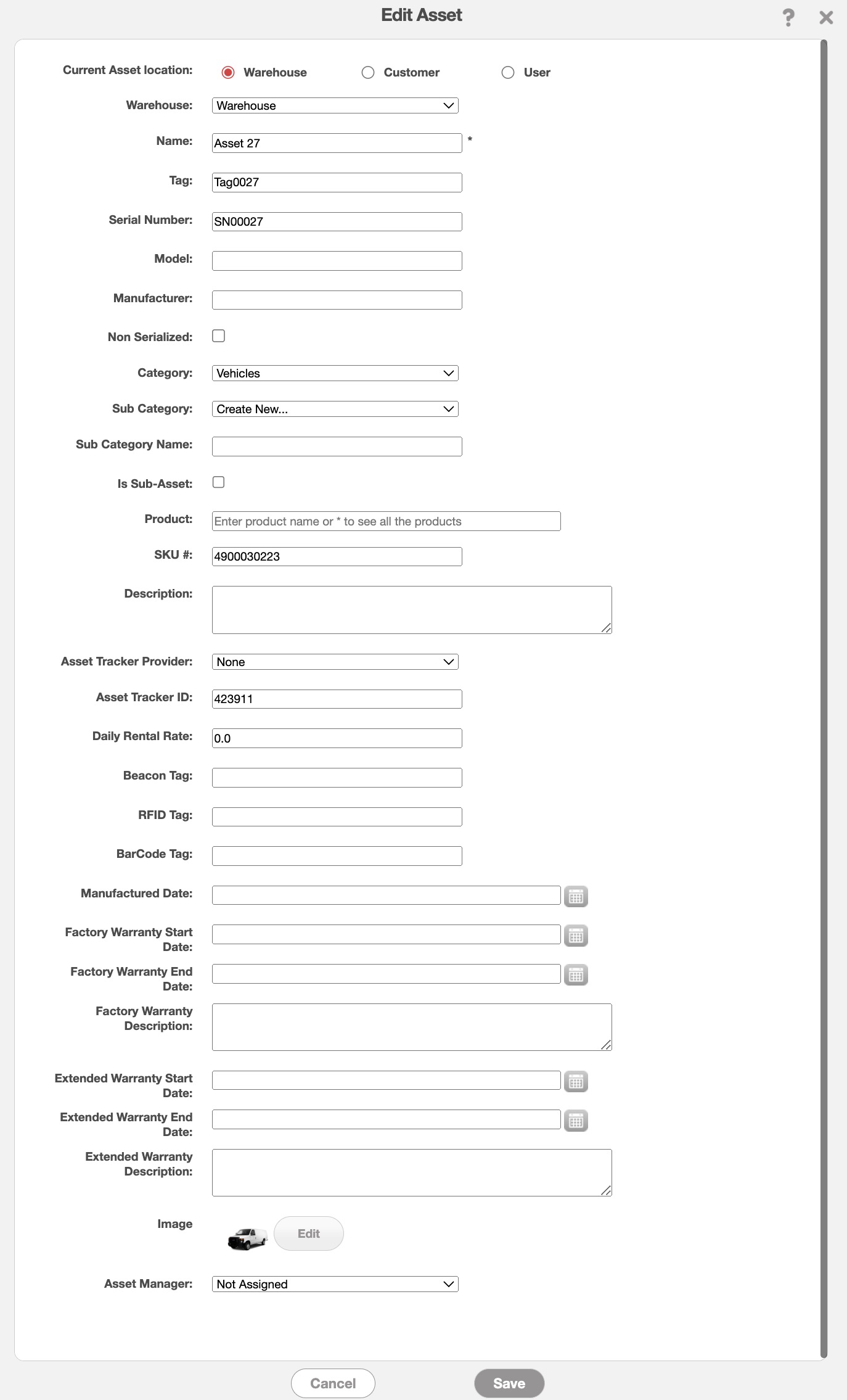In this window you can update the current location of the asset, the description of the asset, upload the asset image, input the daily rental rates for asset usage, and more: