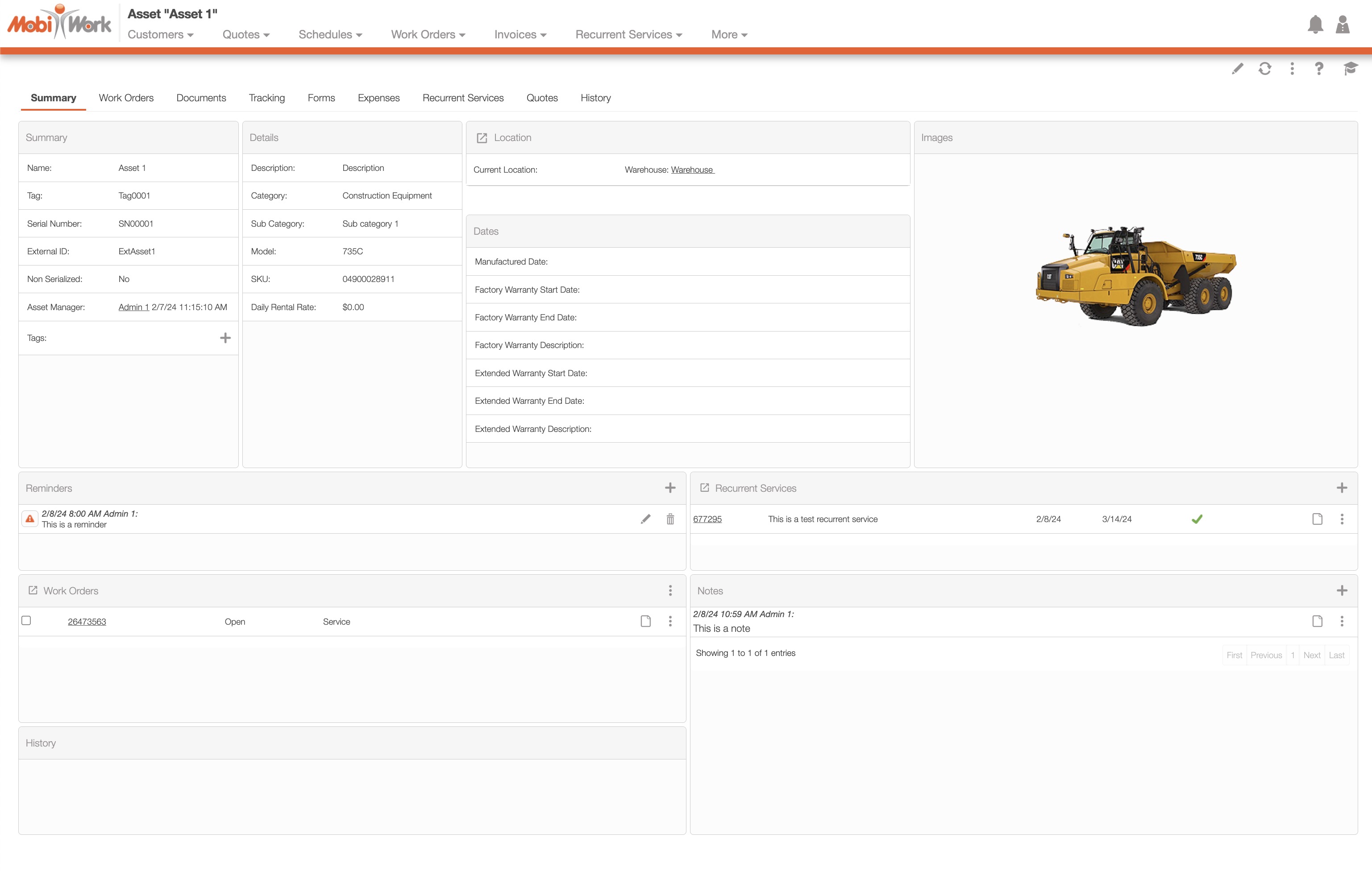The following sections demonstrate some common methods of how to access the View Asset pop-up window from your MobiWork web platform.