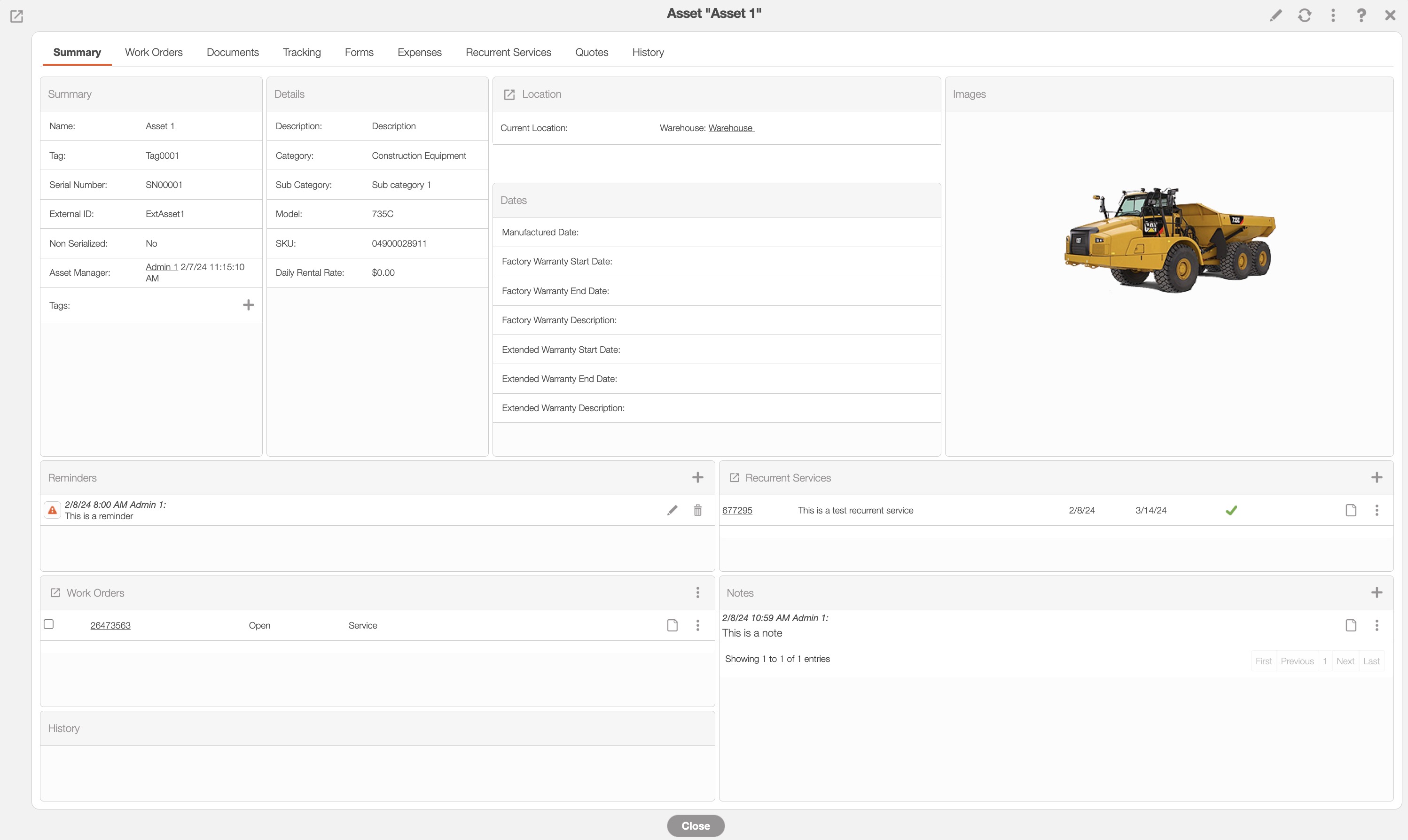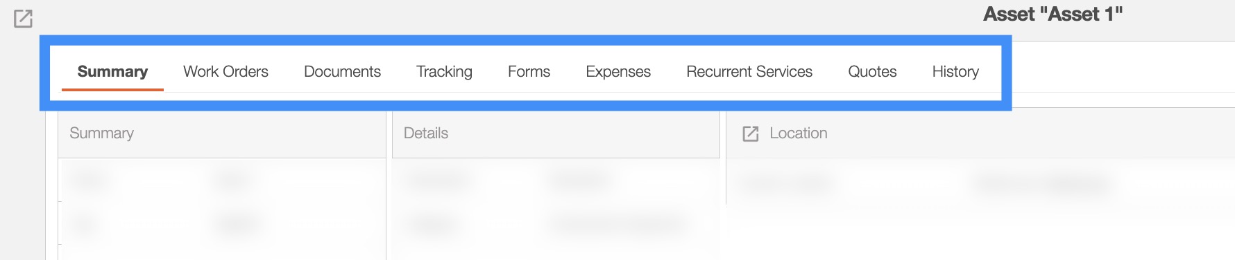 The panels found on the "Summary" tab will summarize the data from the other tabs found in the View Asset pop-up window: