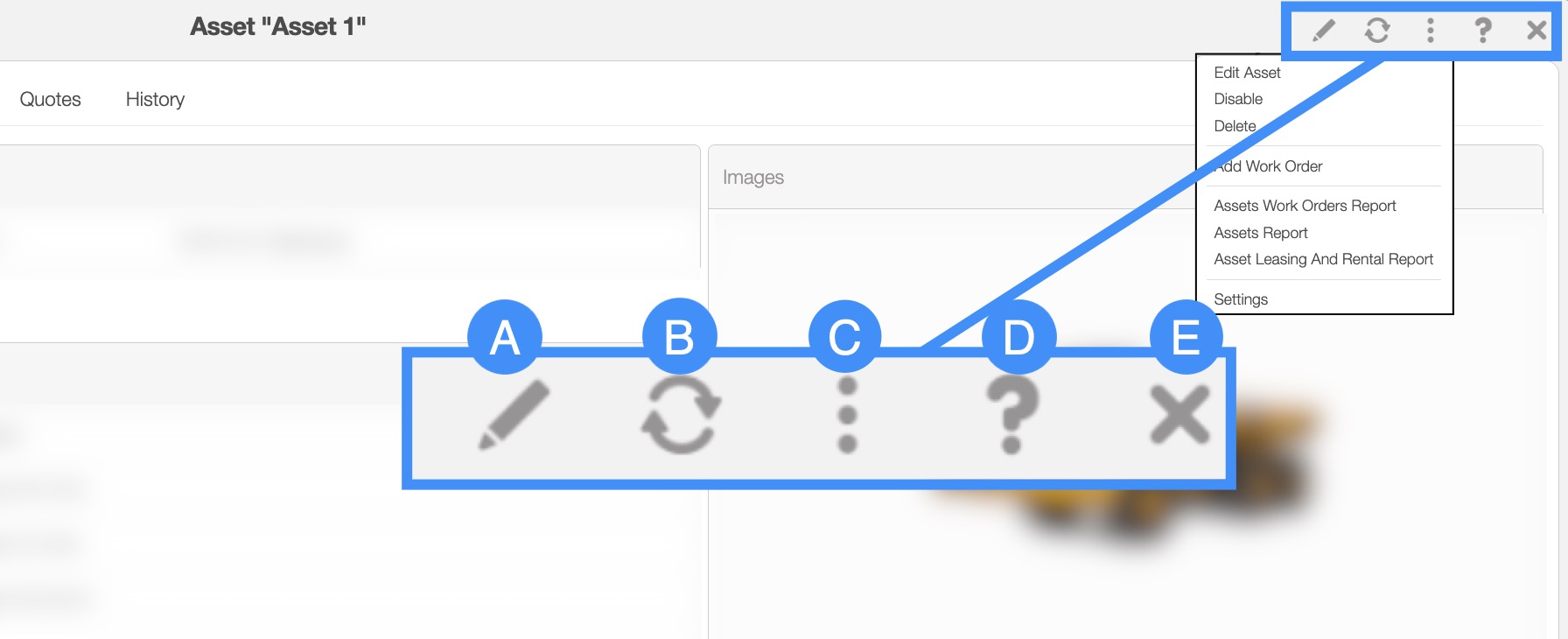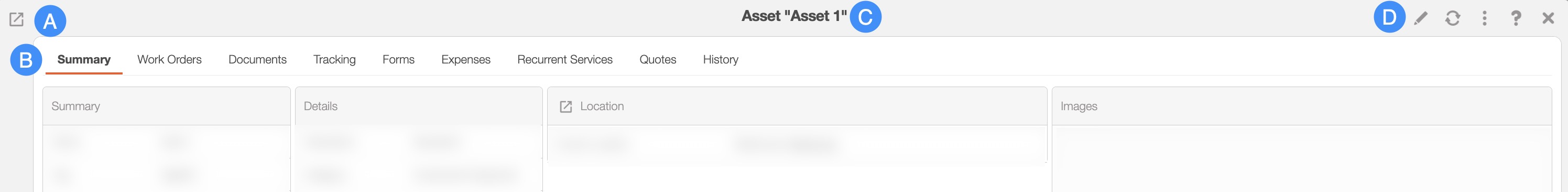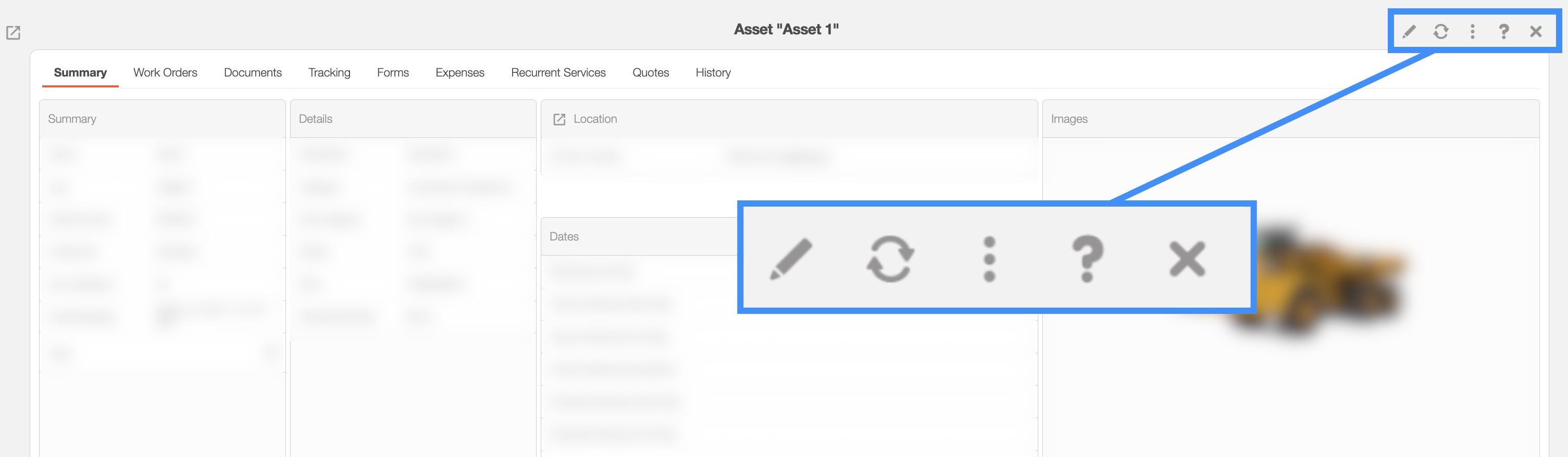 The Asset's Upper Right Corner Actions can be found in the top-right corner of the View Asset pop-up window. These actions are located in this section, regardless of the tab you are on:
