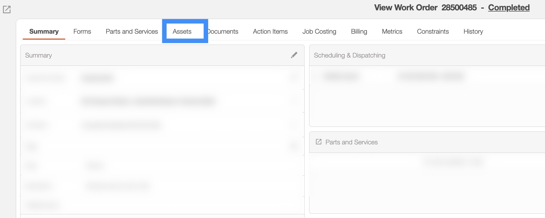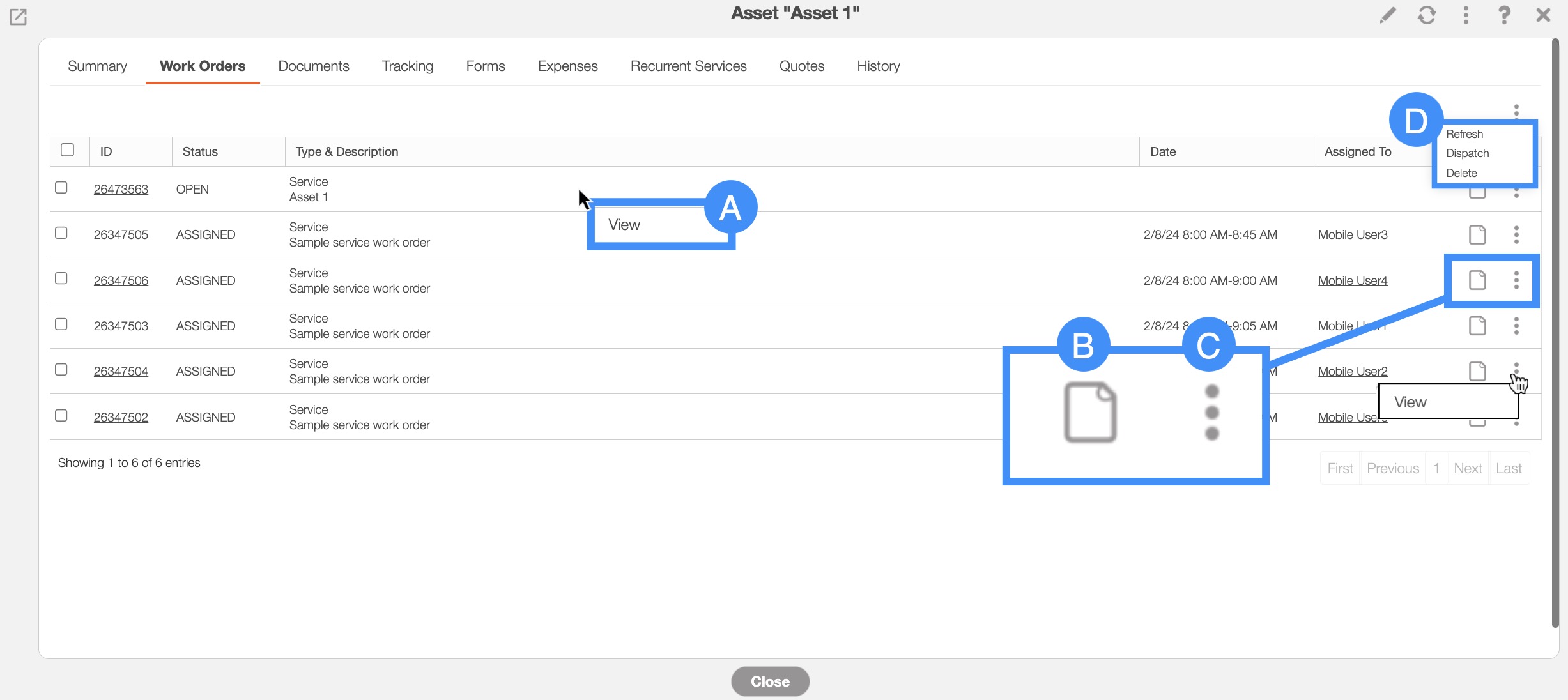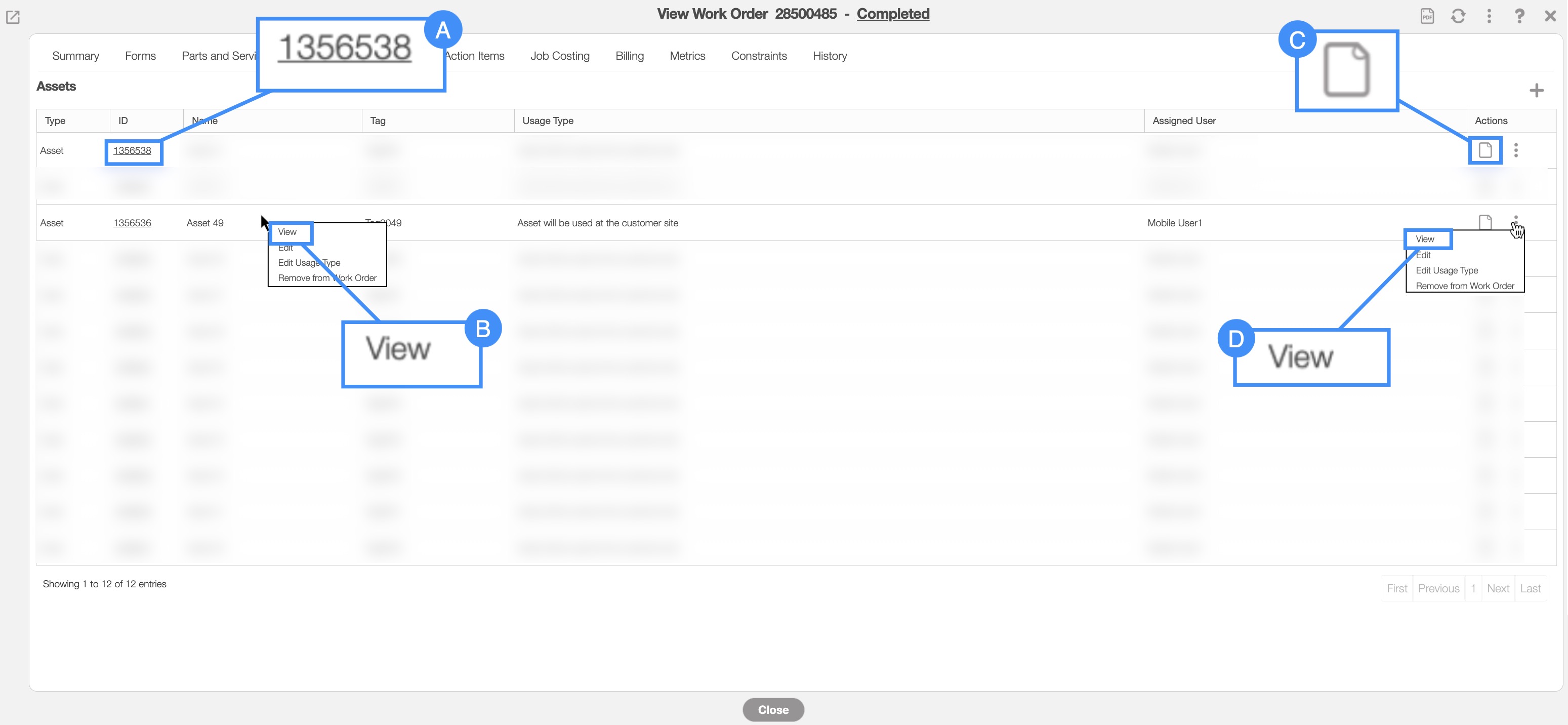 All the assets associated with the work order will be displayed on this tab. To access an individual asset and open its View Asset pop-up window please see the following actions:
