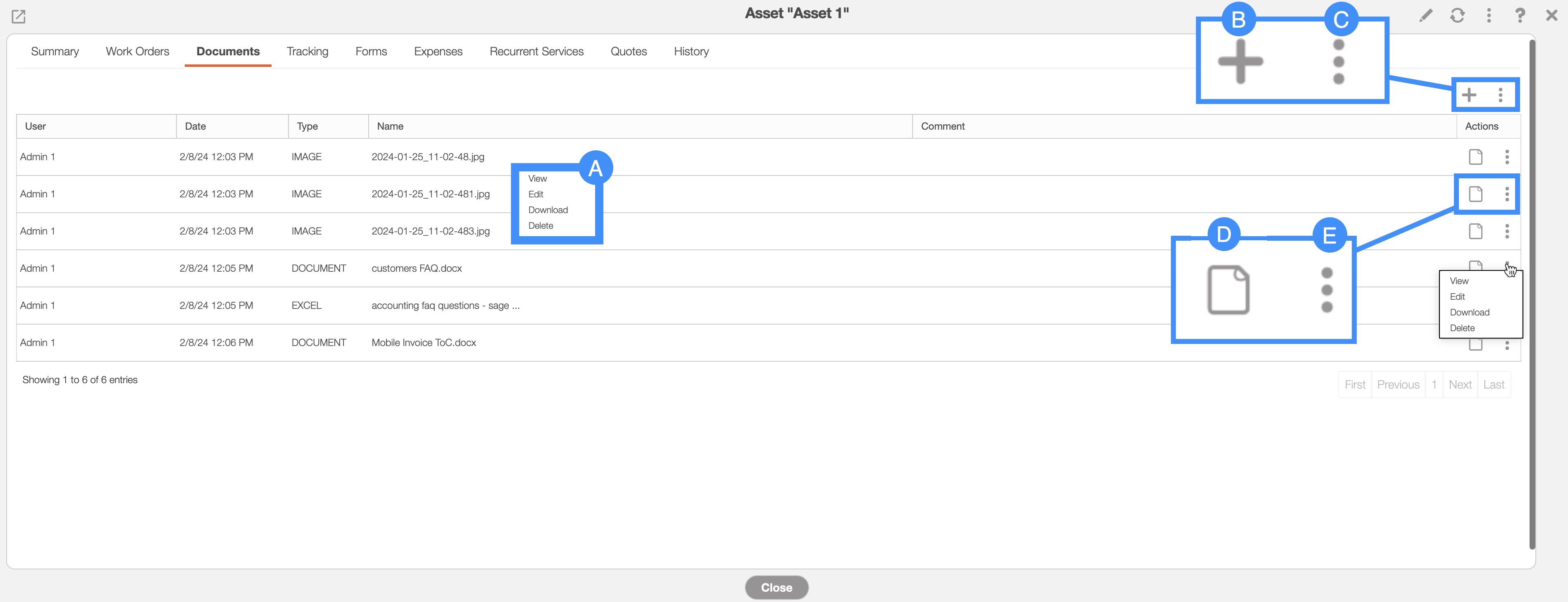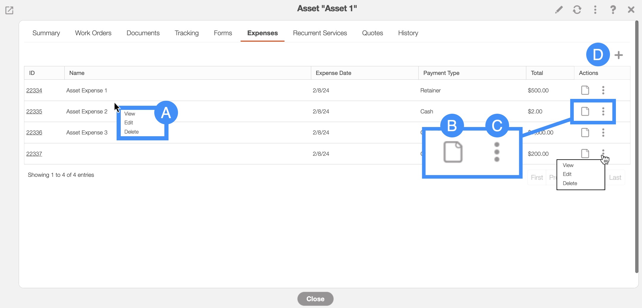 The Individual Actions (the three dots next to the View icon) are identical to the right-click actions and will allow you to view, edit, or delete the expense associated with the asset.