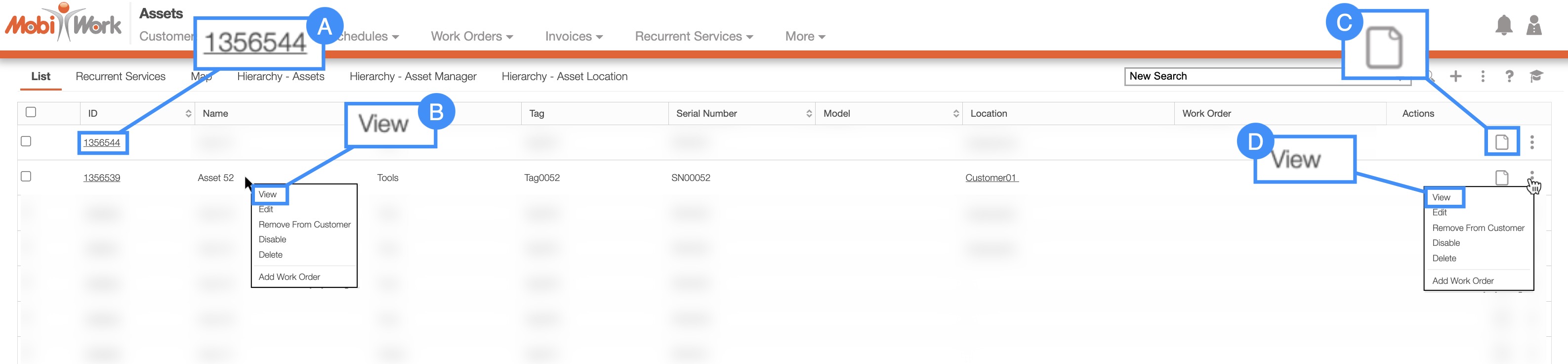 There are several different ways you can access the View Asset pop-up window in MobiWork.