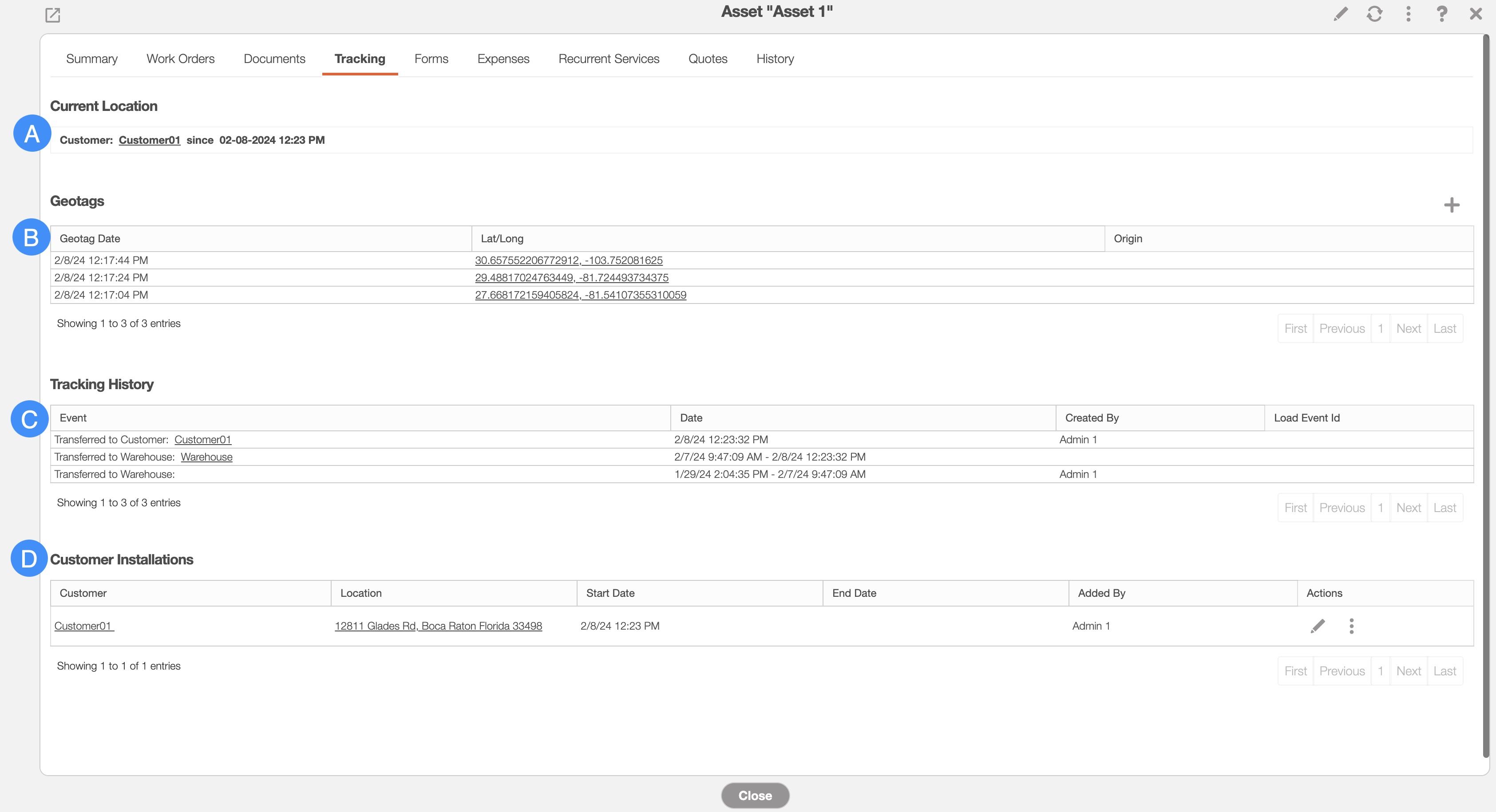 The "Tracking" tab will display the historical and current location of the asset. This tab is divided into four subsections- "Current Location," "Geotags," "Tracking History," and "Customer Installations."