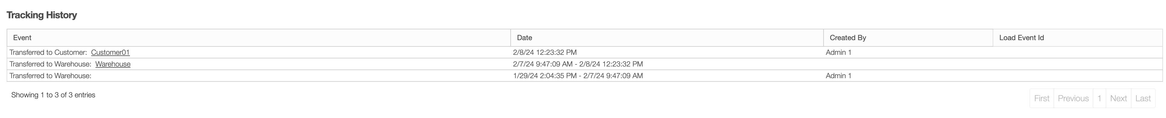 The "Tracking History" subsection will display the previous locations where the asset was held, the date of transfer, the user who created the transfer, and the load event ID: