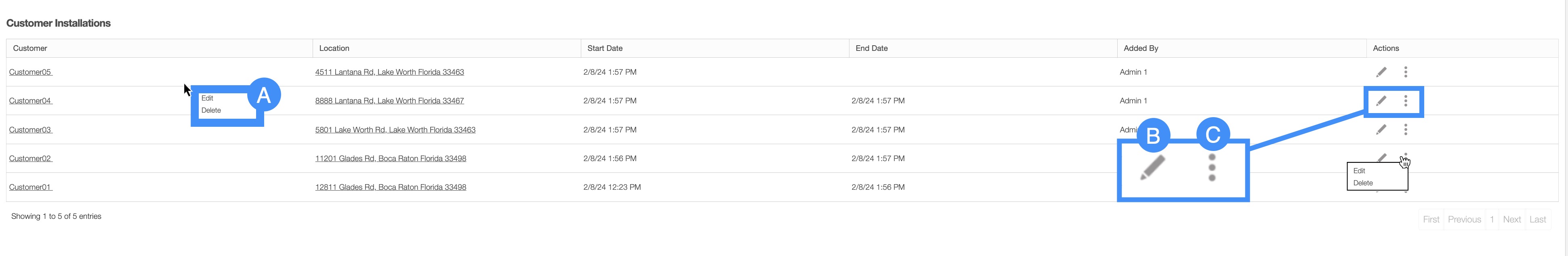 | "Actions" | Allows you to edit or delete the customer installation information |