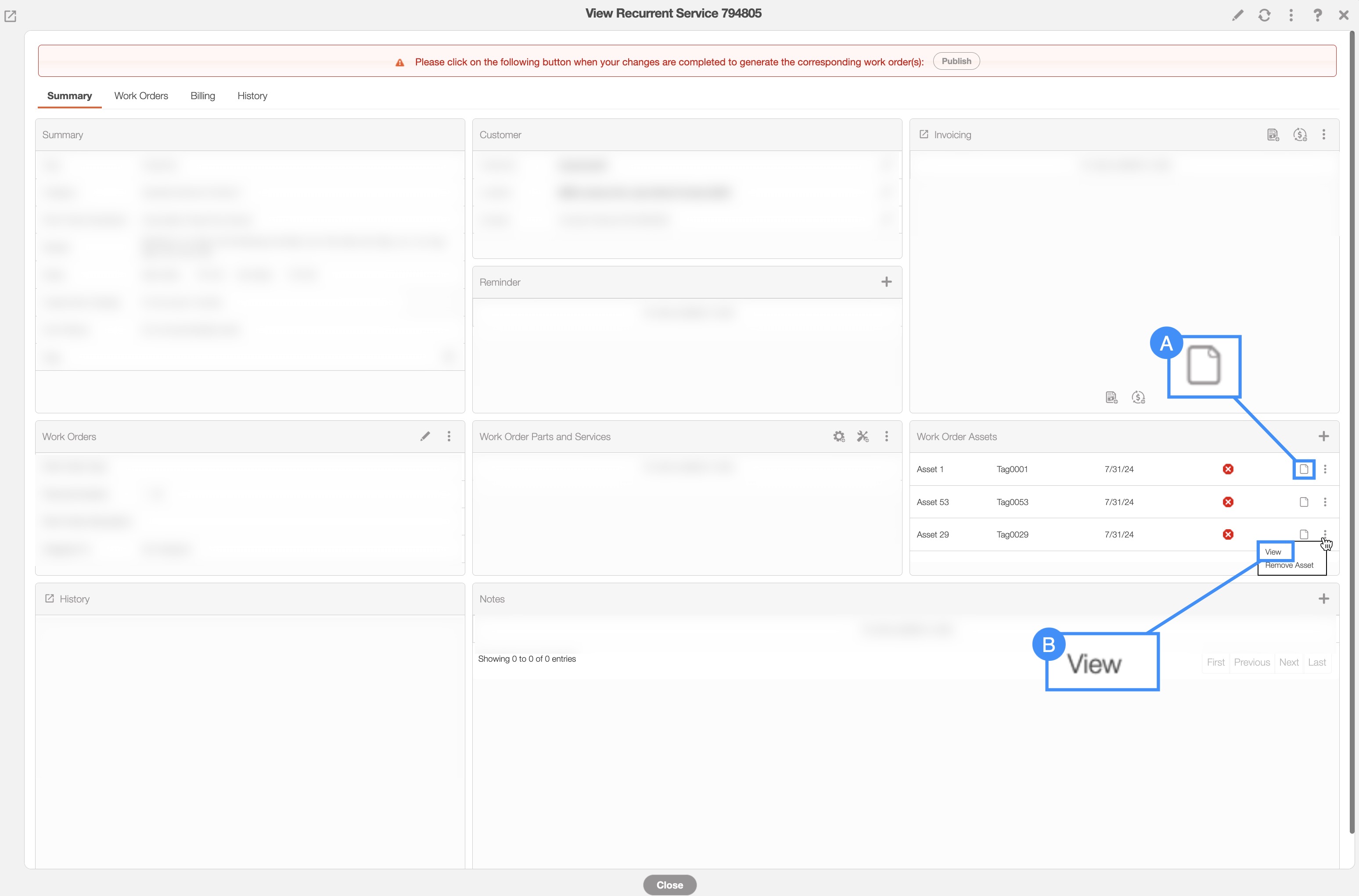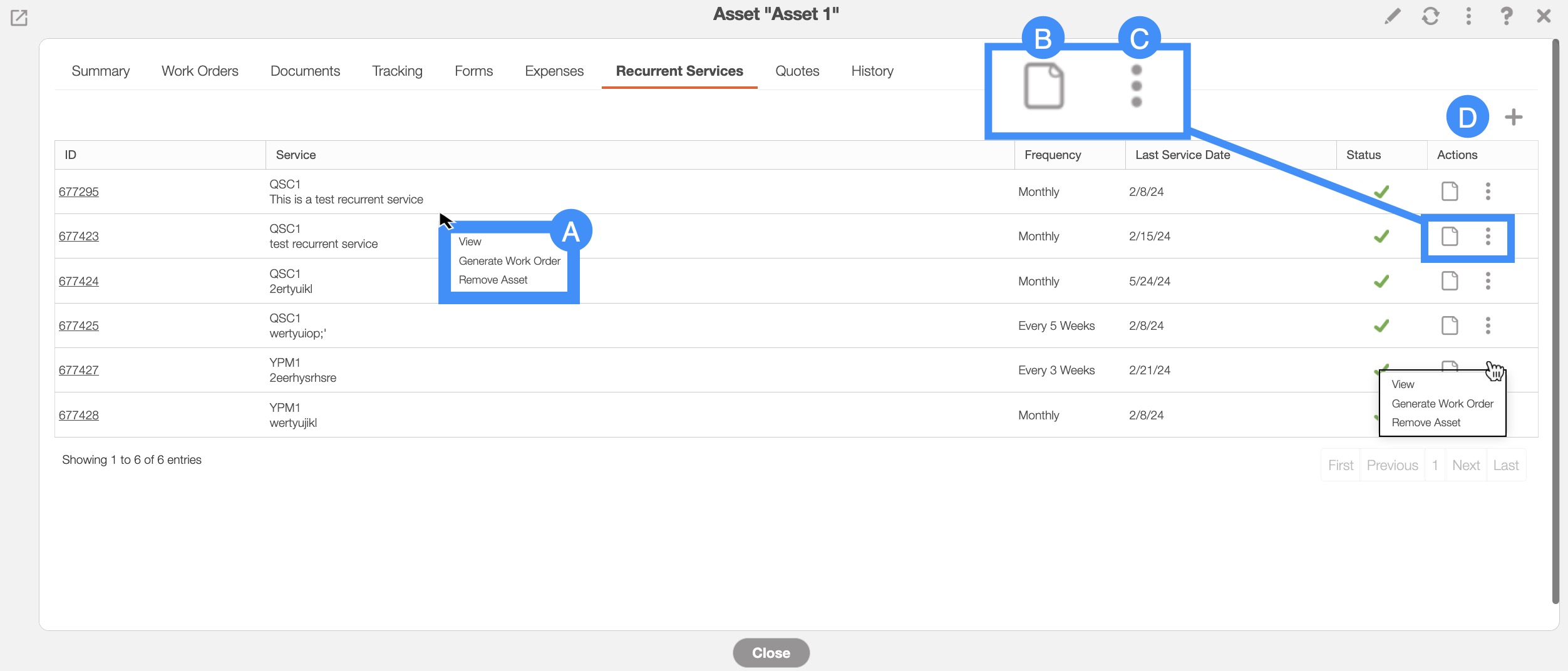 You can also use these features to access the View Asset pop-up window in the "Recurrent Services" tab.