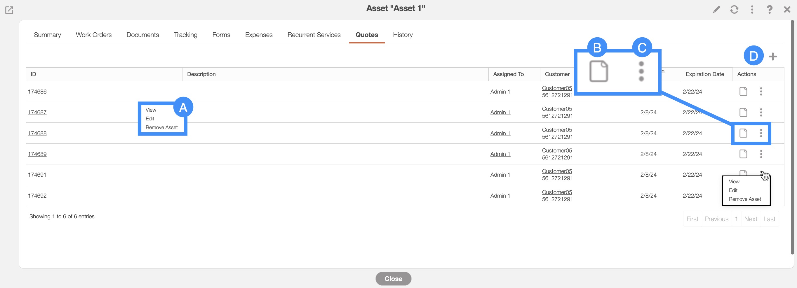 | "Actions" | Allows you to open the View Quote pop-up window, edit the quote, or remove the quote from the asset. |