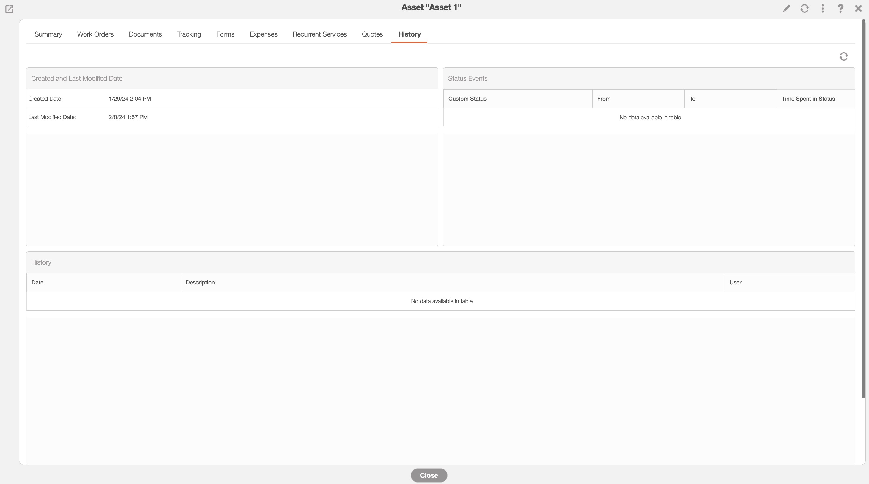 The "History" panel will contain the historical data of the asset (e.g., warehouse updates and more). The data in this box will automatically generate when a specified event or status is reached.