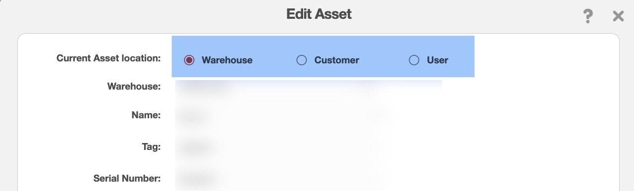 The "Tracking" tab will allow you to allow you to track the movements of your assets. To transfer your asset to a customer, user, or warehouse, you will first need to access the Edit Asset pop-up window. In this pop-up window, select the desired current location: