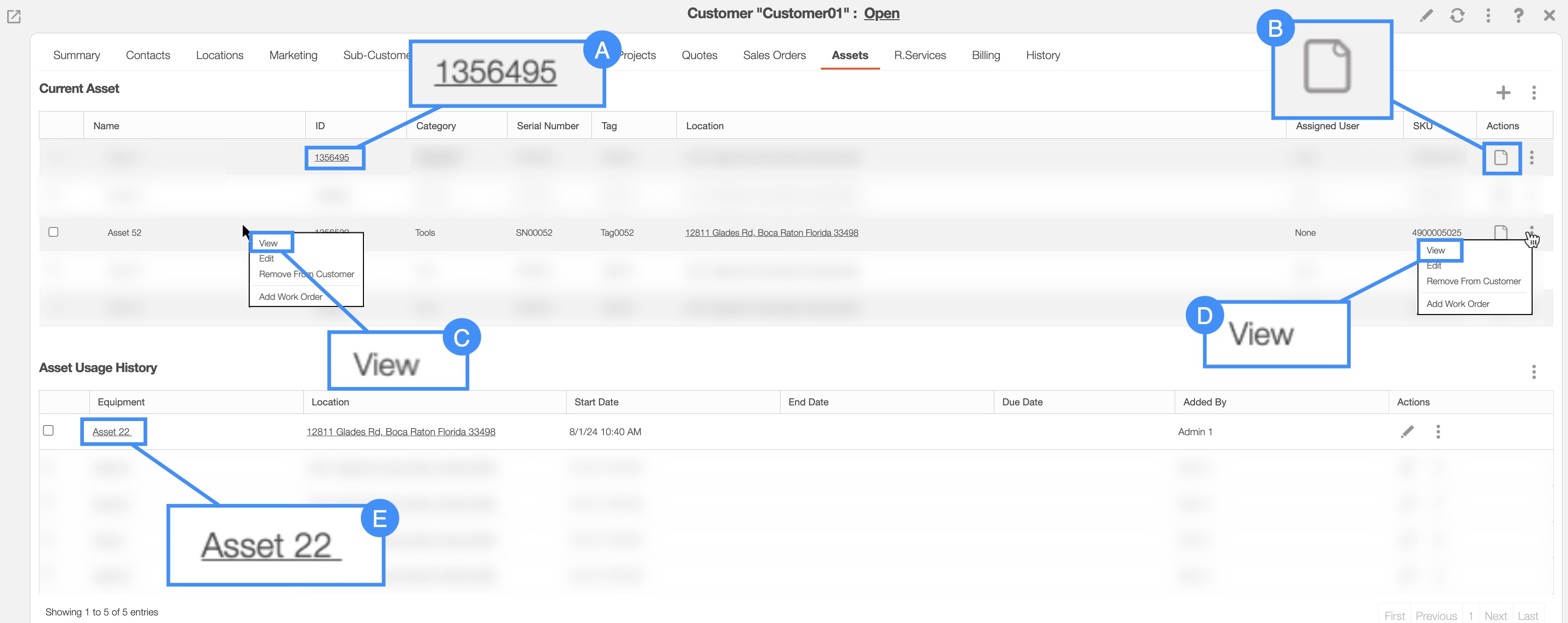All the assets associated with the customer will be displayed on this tab. To access an individual asset and open its View Asset pop-up window please see the following actions:
