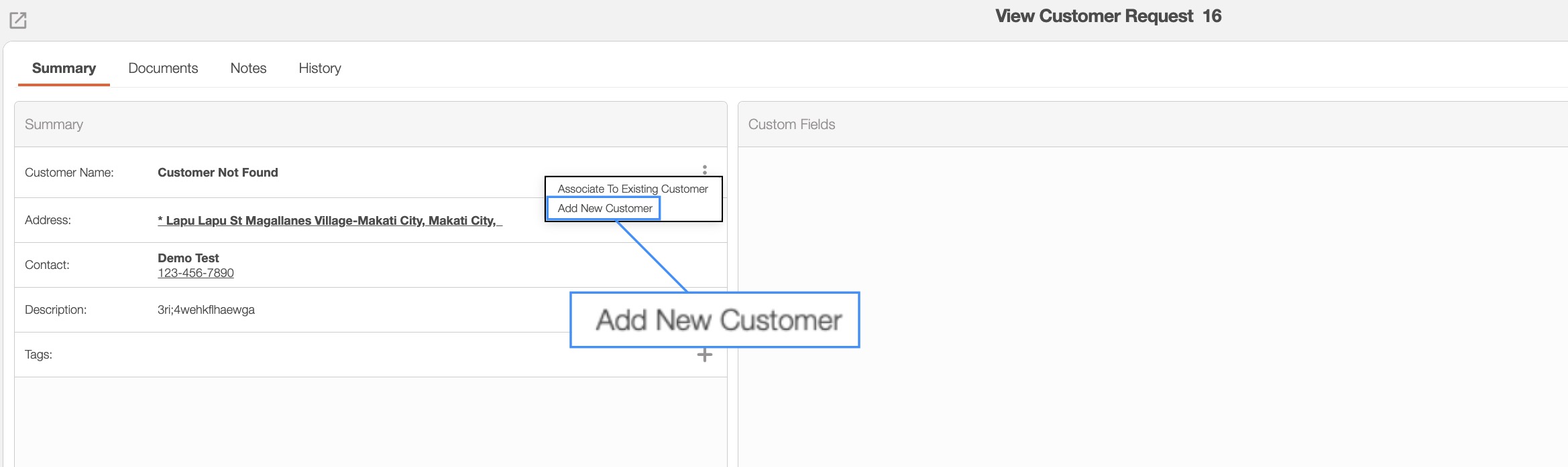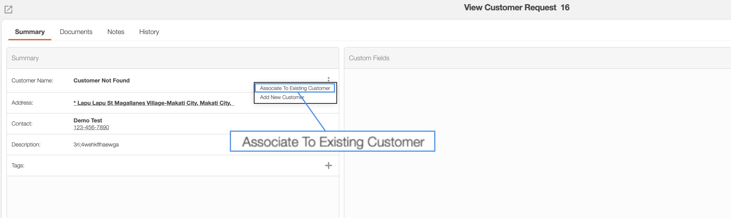 If a customer request has been submitted and the customer is not in your system, you can either associate the contact with an existing customer or create a new one.
