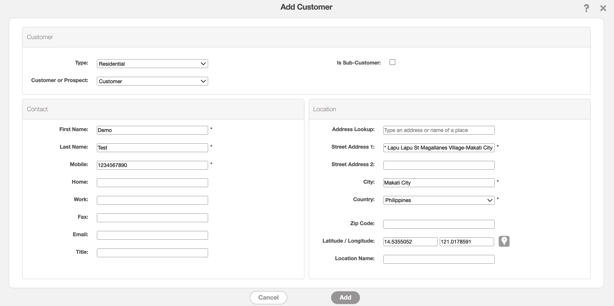 This action will open the Add Customer pop-up window, allowing you to input the new customer details: