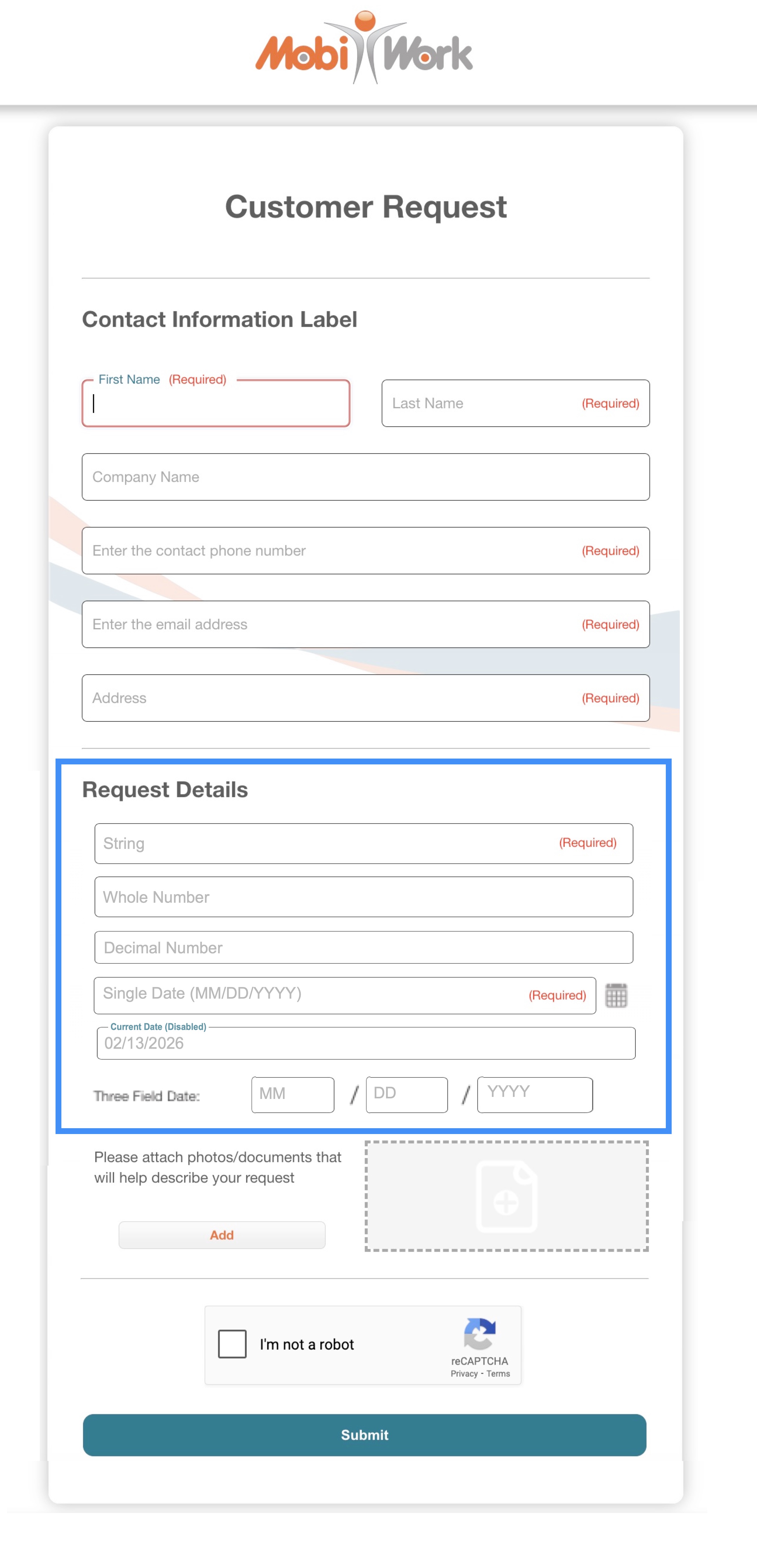You will be able to customize the request header and text as well as add additional fields to the "Request Details" section. If you would like to adjust the header, text, or add additional fields, please contact us: