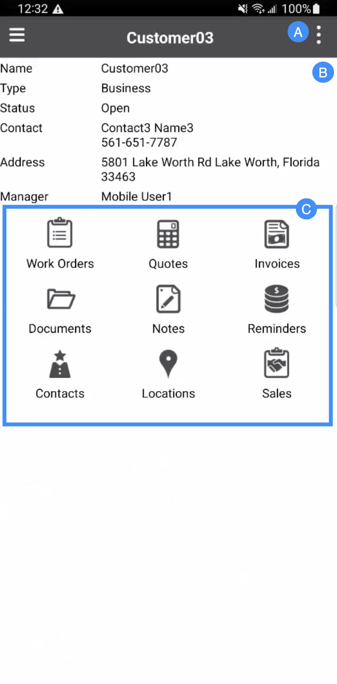 This section will highlight how to view a customer in the MobiWork App and the features that you can access from the View Customer feature page.