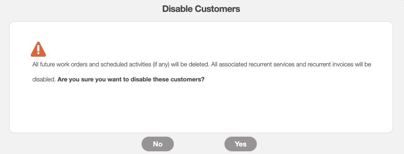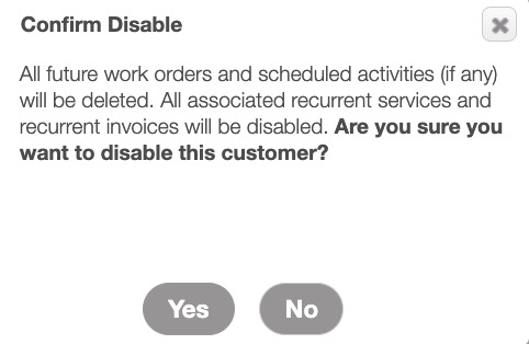 Click the Yes button to confirm that you would like the selected customer to be disabled. Once confirmed, the customer will automatically be disabled, and you will no longer be able to create work orders for the customer from MobiWork. Furthermore, all future work orders and scheduled activities will be deleted.