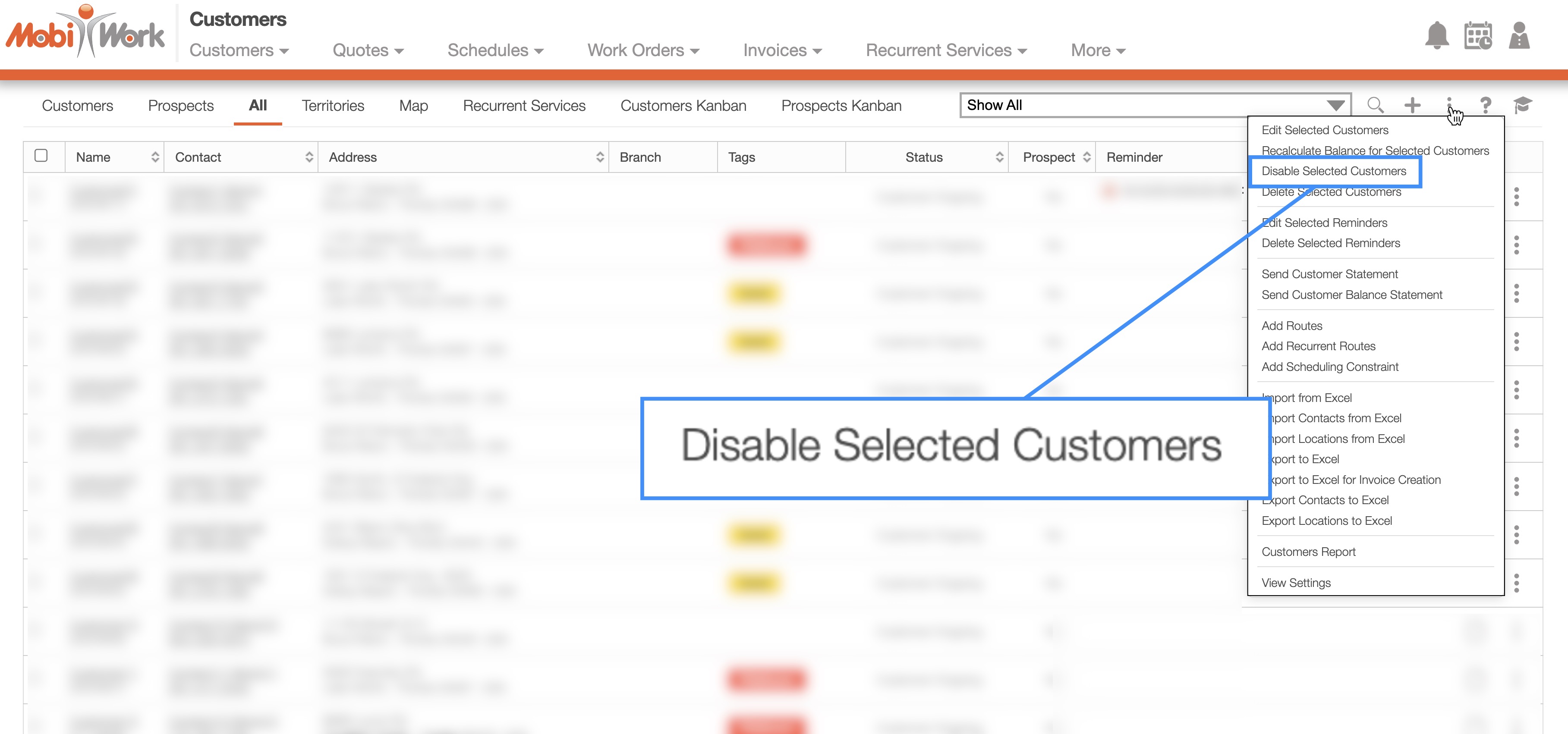 MobiWork allows you to disable multiple customers at once, thus saving you time and energy from having to disable customers one at a time.