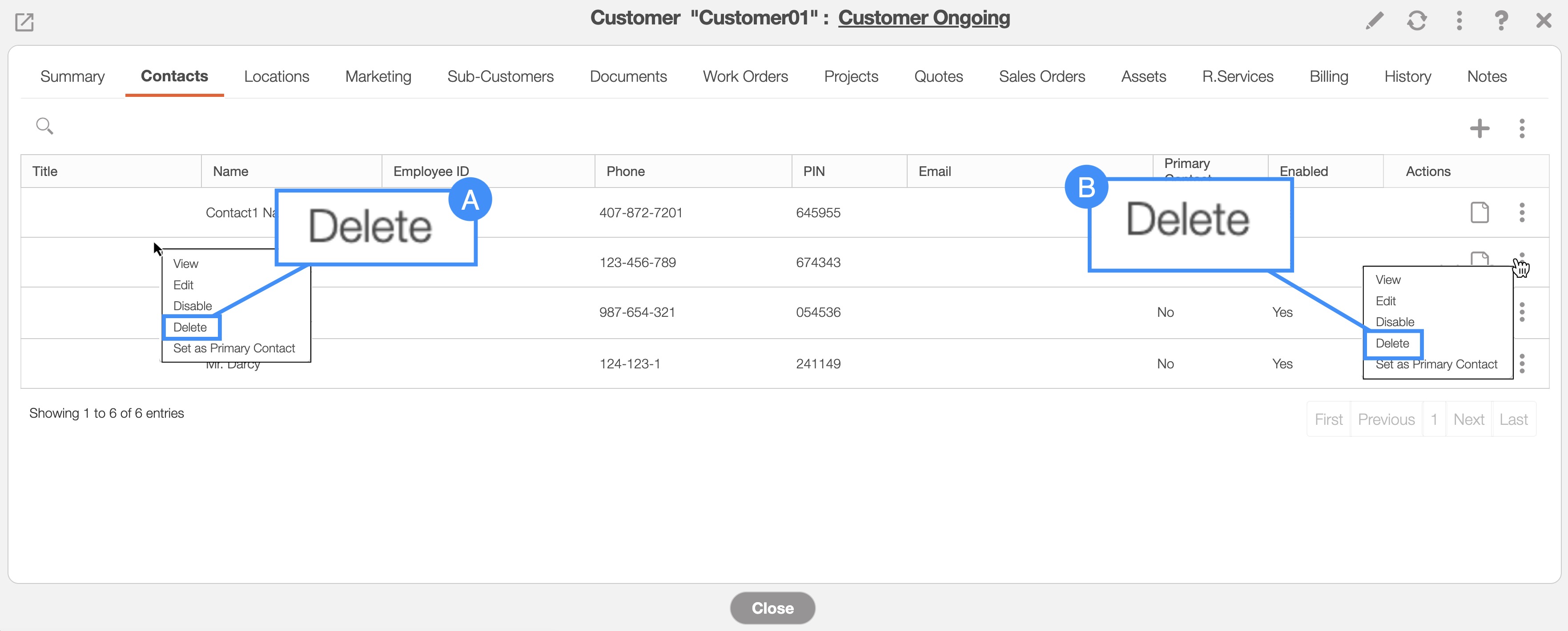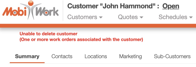 Please note that if there are any work orders associated with the customer, you will be unable to delete the customer: