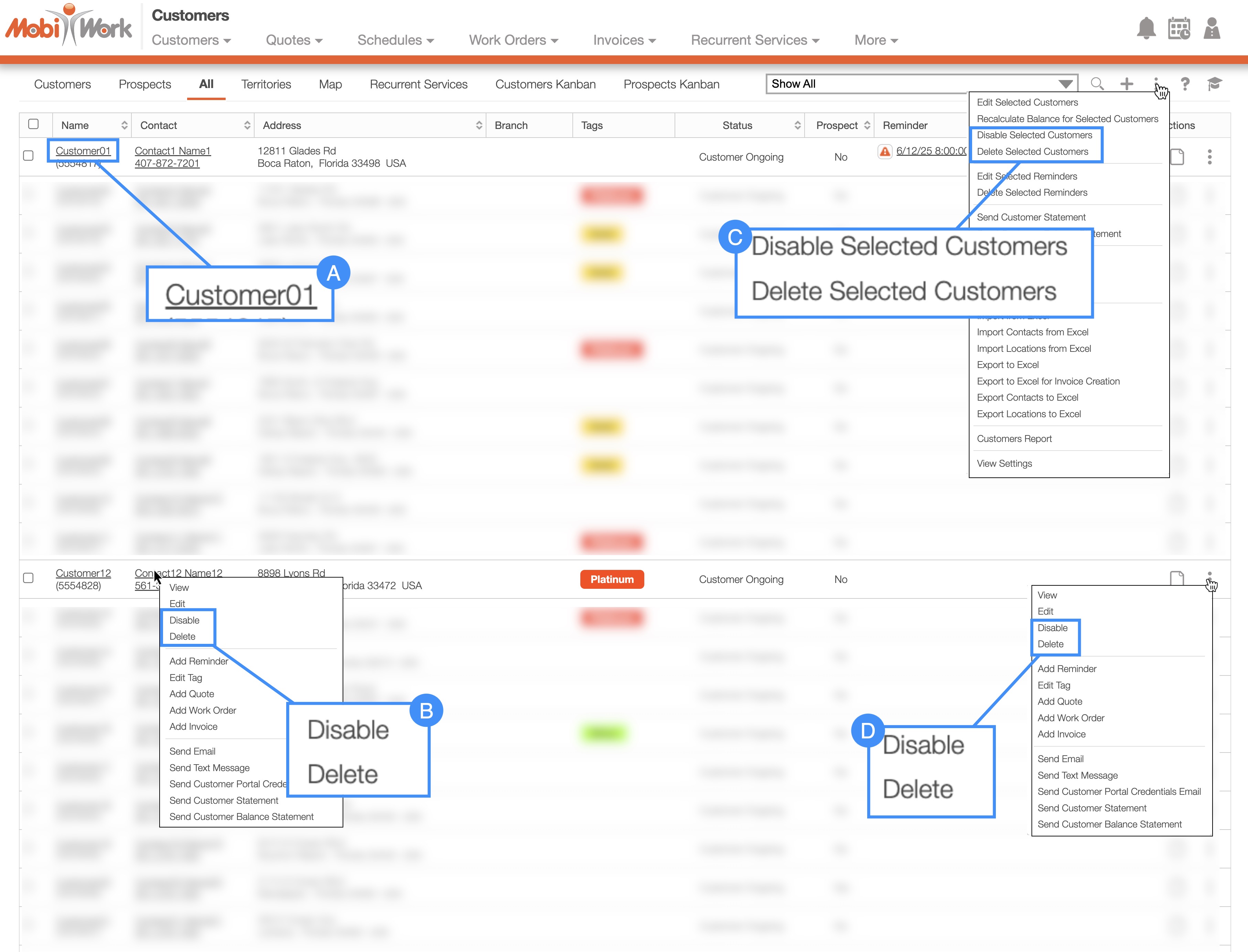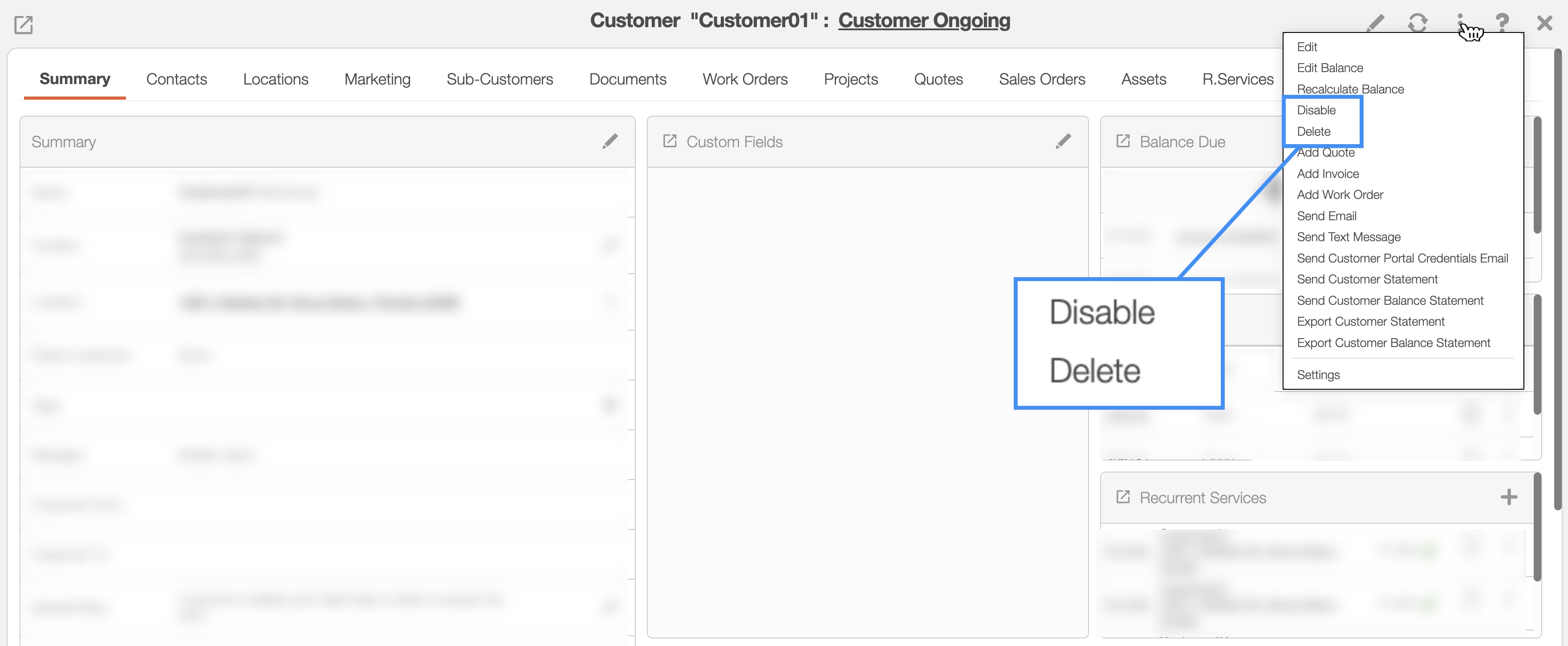 Disabling a customer restricts the creation of new work orders, recurrent services, etc. for that customer, ensuring you maintain a tight grip on your service operations. This section will highlight how to access the delete and disable features.
