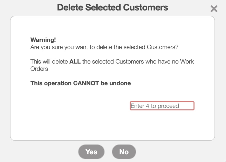 - A warning will then appear asking to confirm if you would like to delete the selected customers, and informing you that the deletion of the customers without work orders will be permanent: