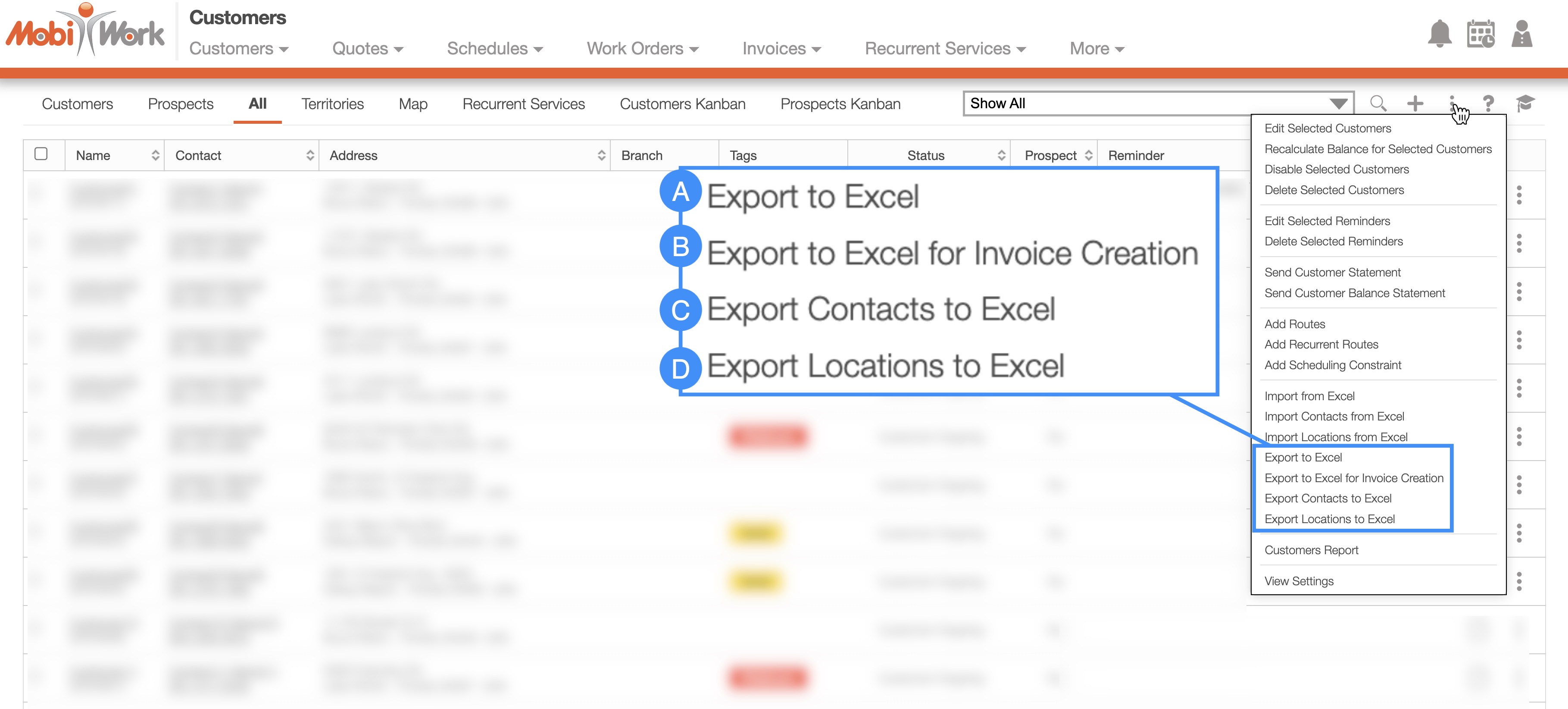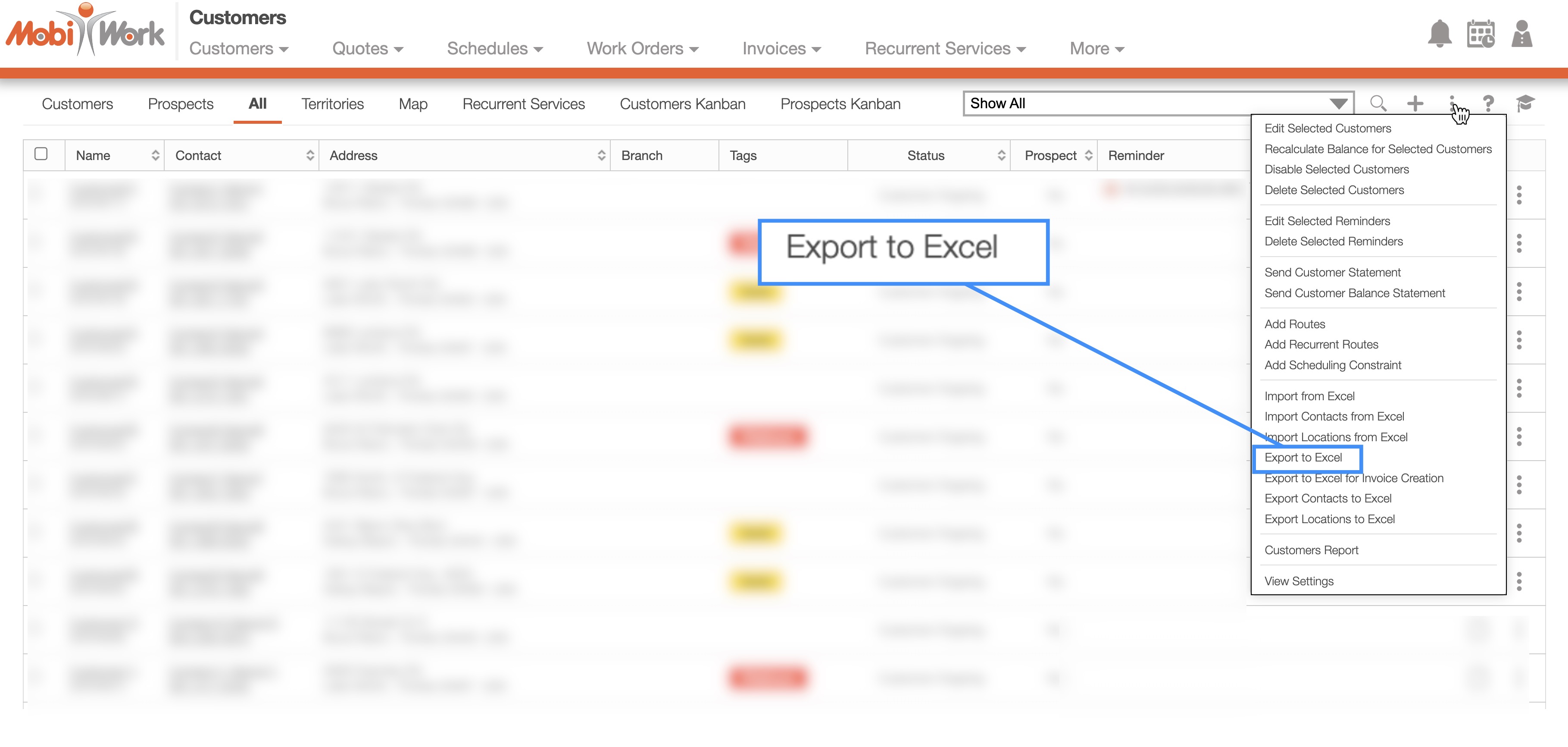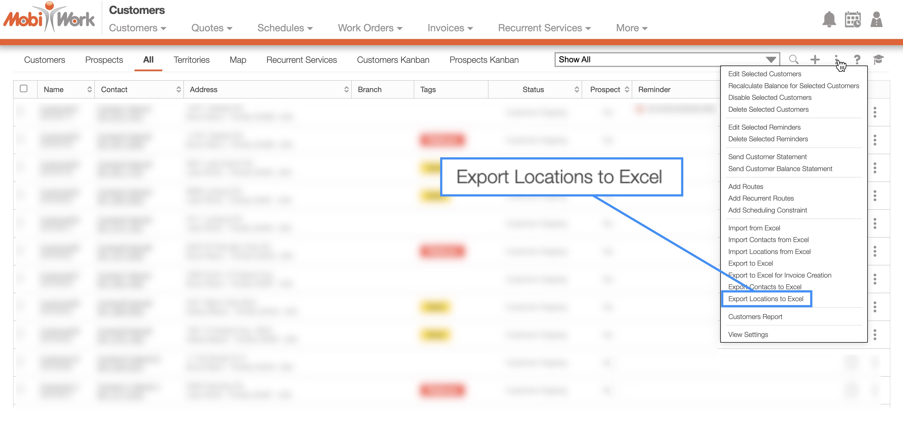 Once you are done updating your customers, you can import the Excel file back into MobiWork. You can accomplish this by selecting the "Import Customers from Excel" option from the More Actions drop-down on the feature page. For more information on how to import cusomters, please see the Add Customer page.