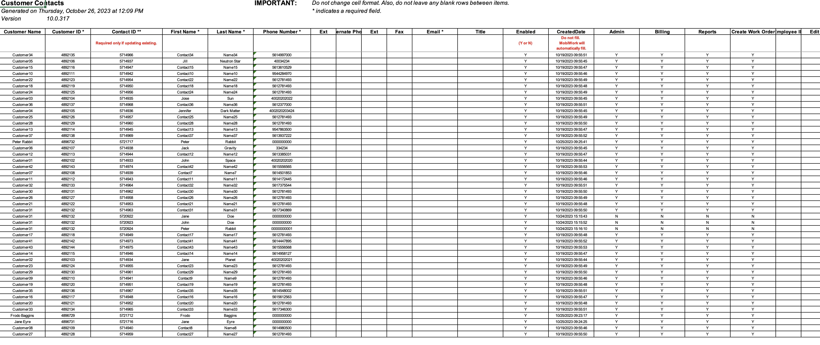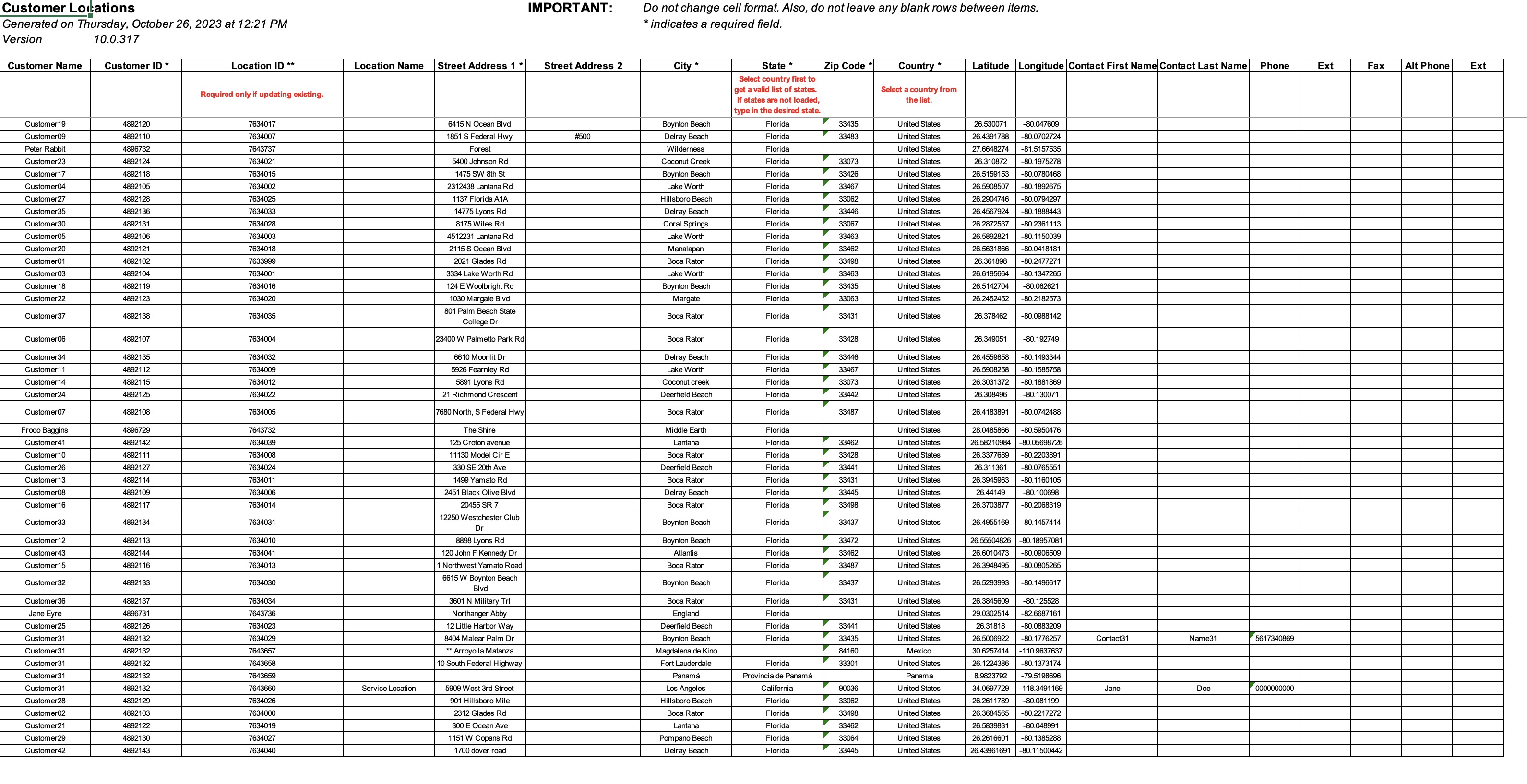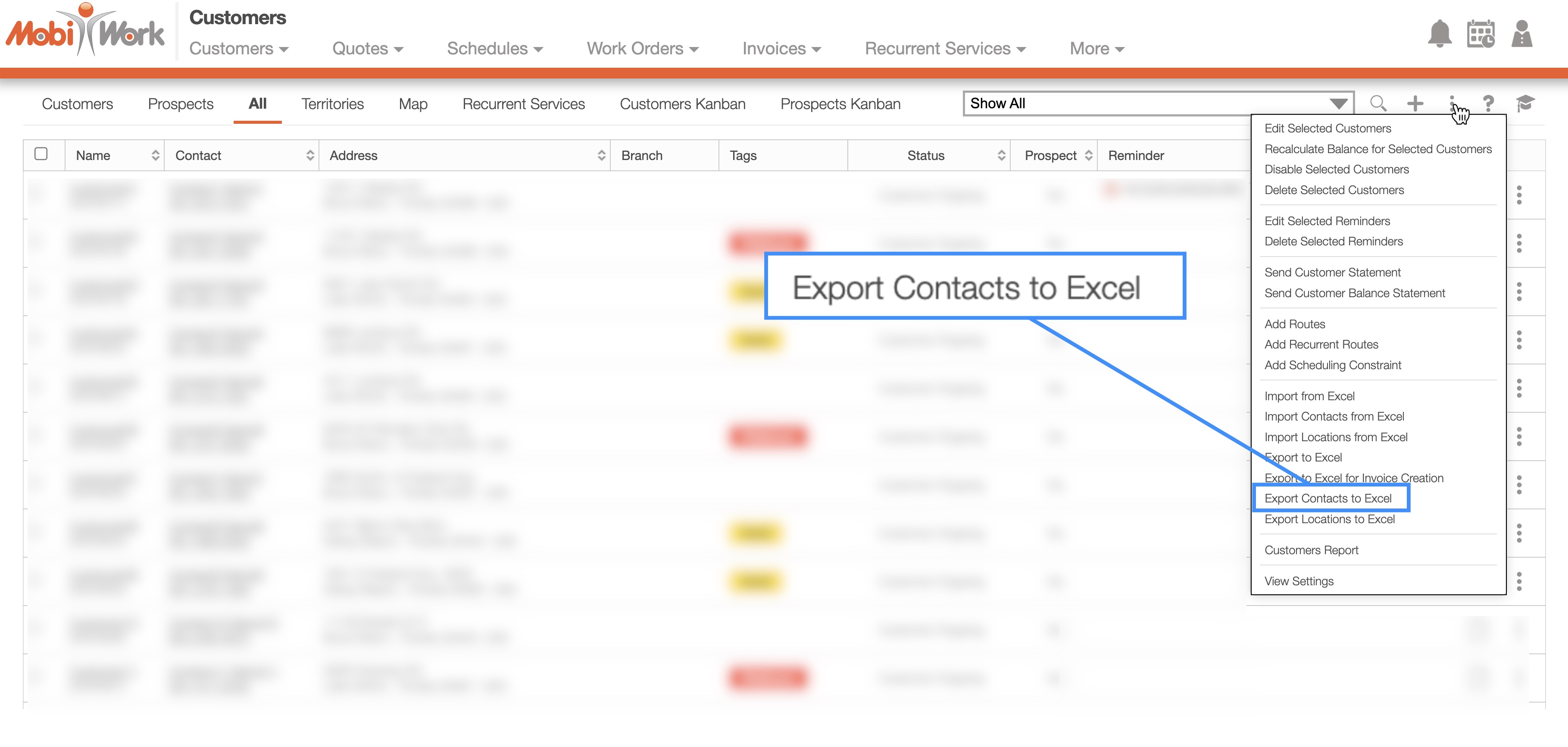Once you are done updating your customers, you can import the Excel file back into MobiWork. You can accomplish this by selecting the "Import Customers from Excel" option from the More Actions drop-down on the feature page. For more information on how to import cusomters, please see the Add Customer page.