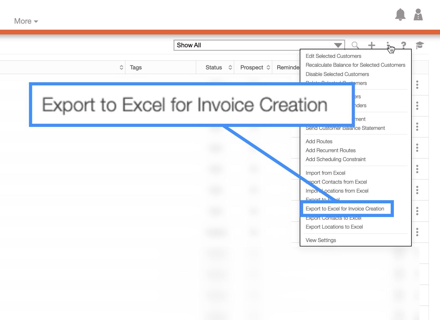 - Click on the More Actions button and from the drop-down menu select the "Export to Excel for Invoice Creation" option: