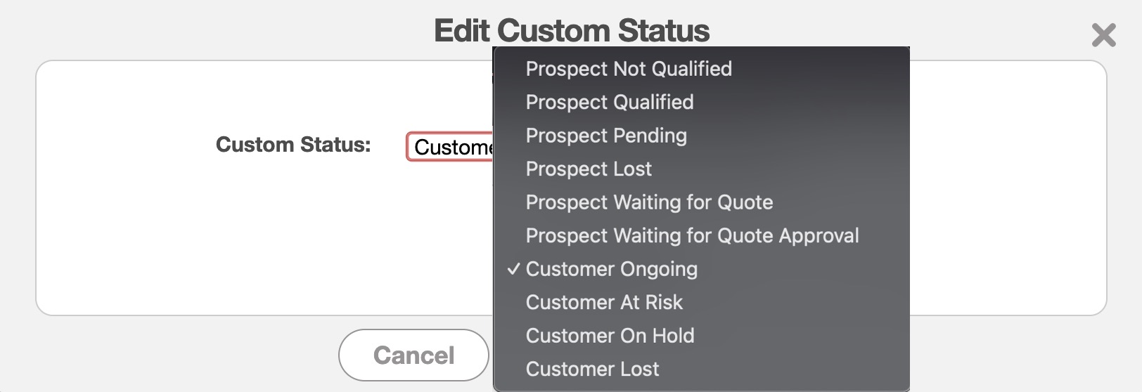The "Custom Status" drop-down will update the status of the customers (The status can be "Open," "Ongoing," "At Risk," "On Hold," or "Lost").