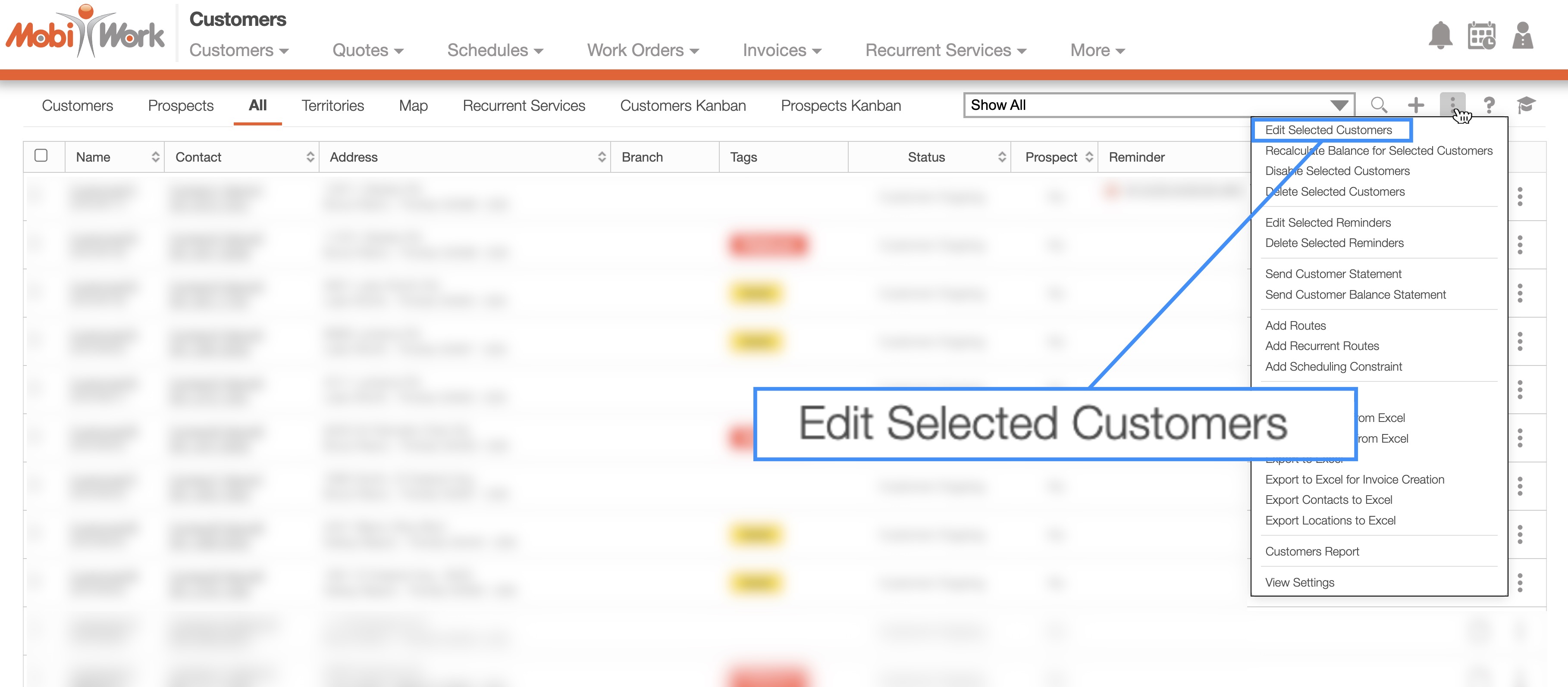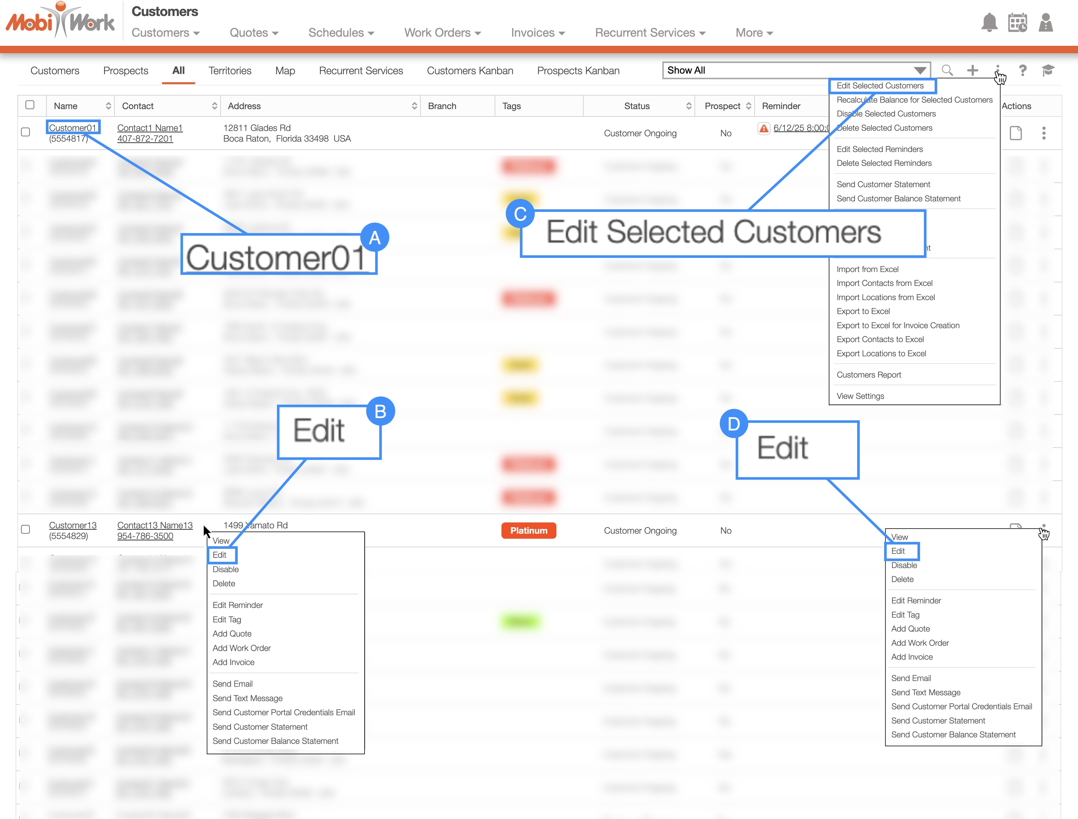Discover the efficiency and convenience of fine-tuning your customer or prospect details to perfection. Whether you need to update a single customer or tackle multiple customers at once, our platform puts the tools you need at your fingertips. This page will guide you through the process of accessing and utilizing the MobiWork customer editing feature.