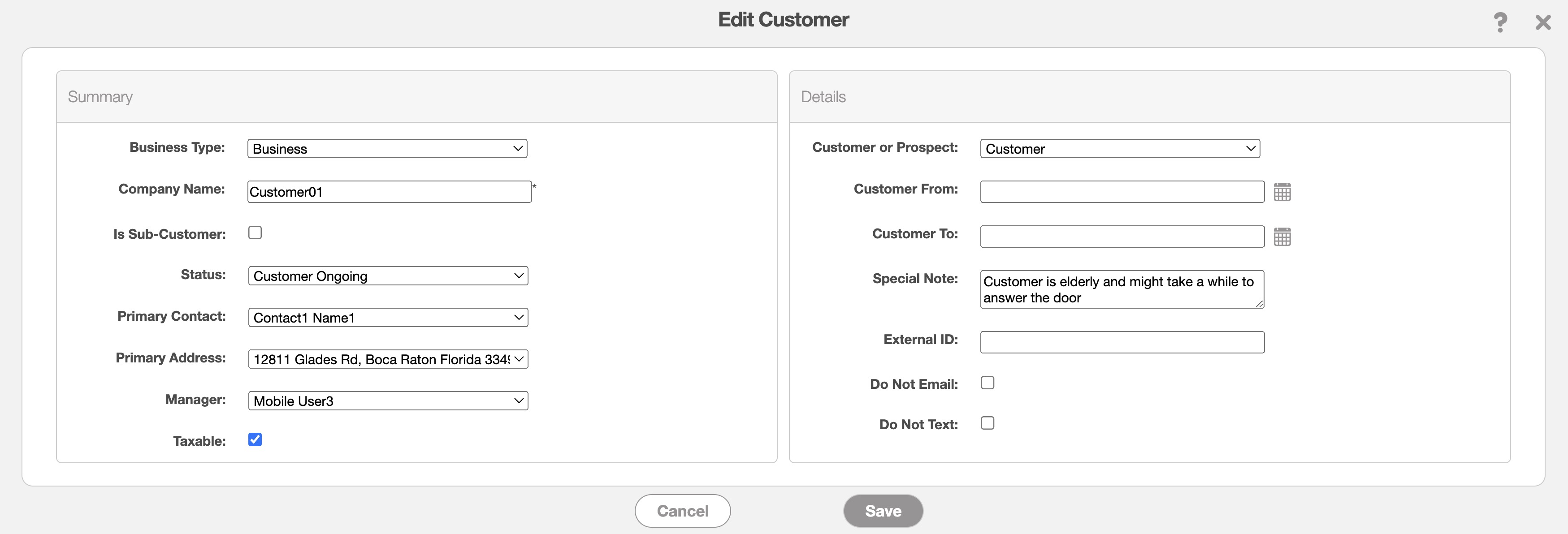 | "Special Note" | Any special notes or comments regarding the customer. |