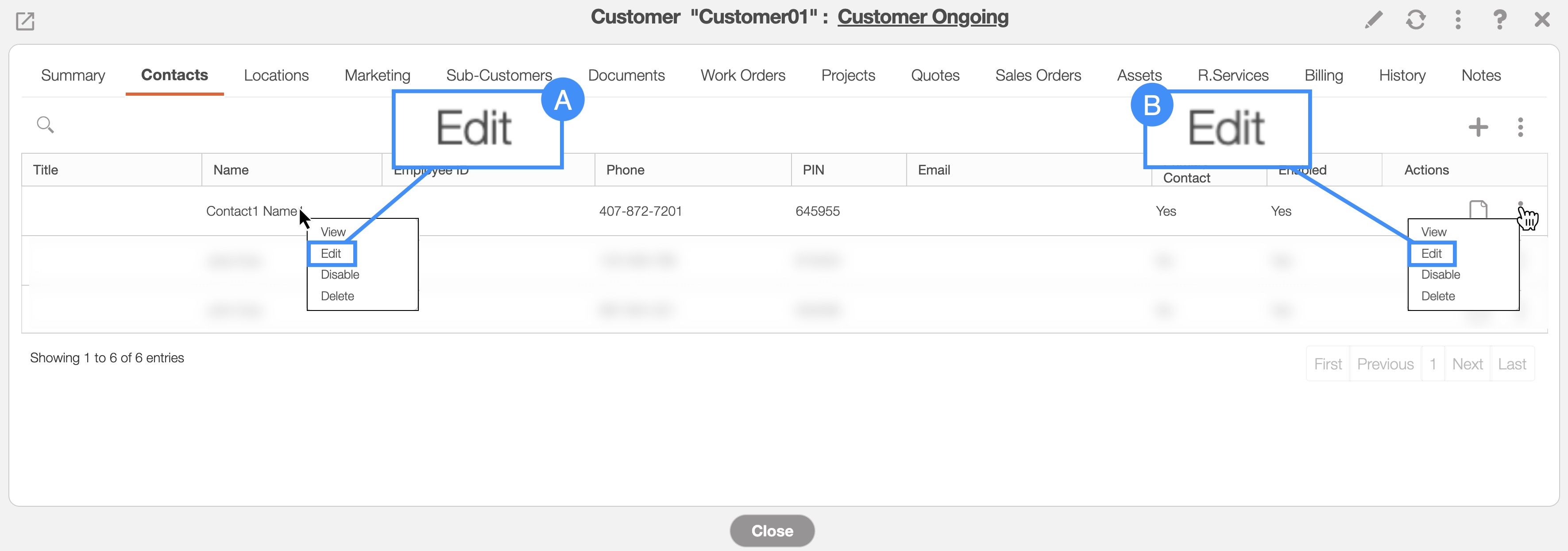 You can edit a contact under the customer profile. All listed contacts associated with the customer can be found in the "Contacts" tab within the View Customer pop-up window.
