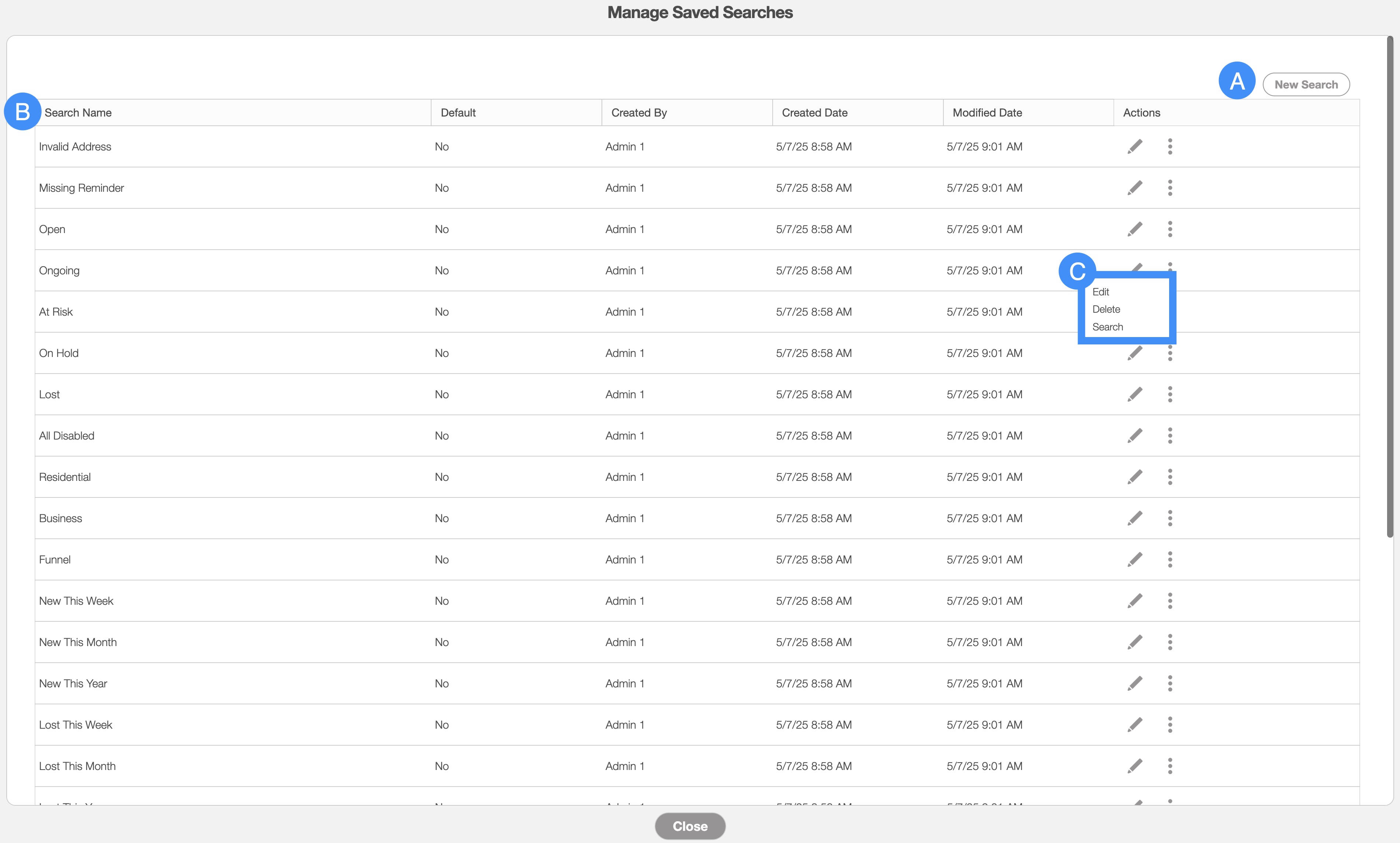 To manage, edit, or remove any Saved Searches you can access the "Manage Saved Searches" option in the drop-down menu; the Manage Saved Searches pop-up window will then appear: