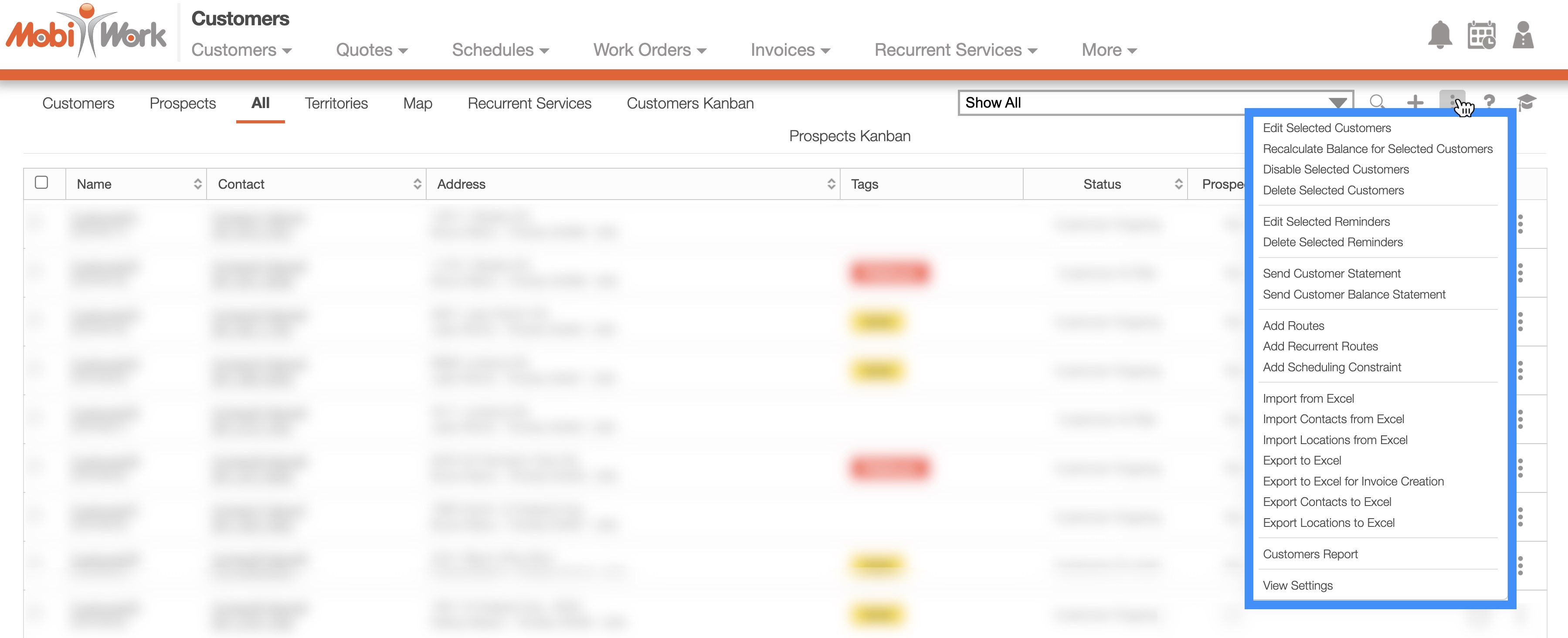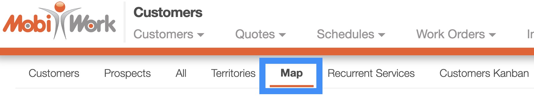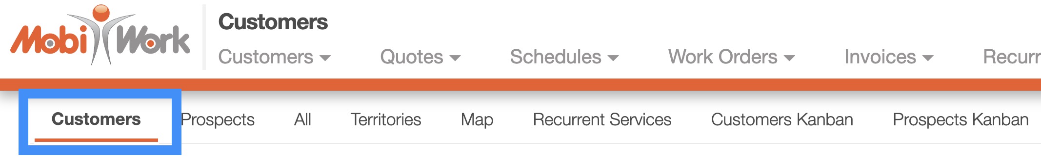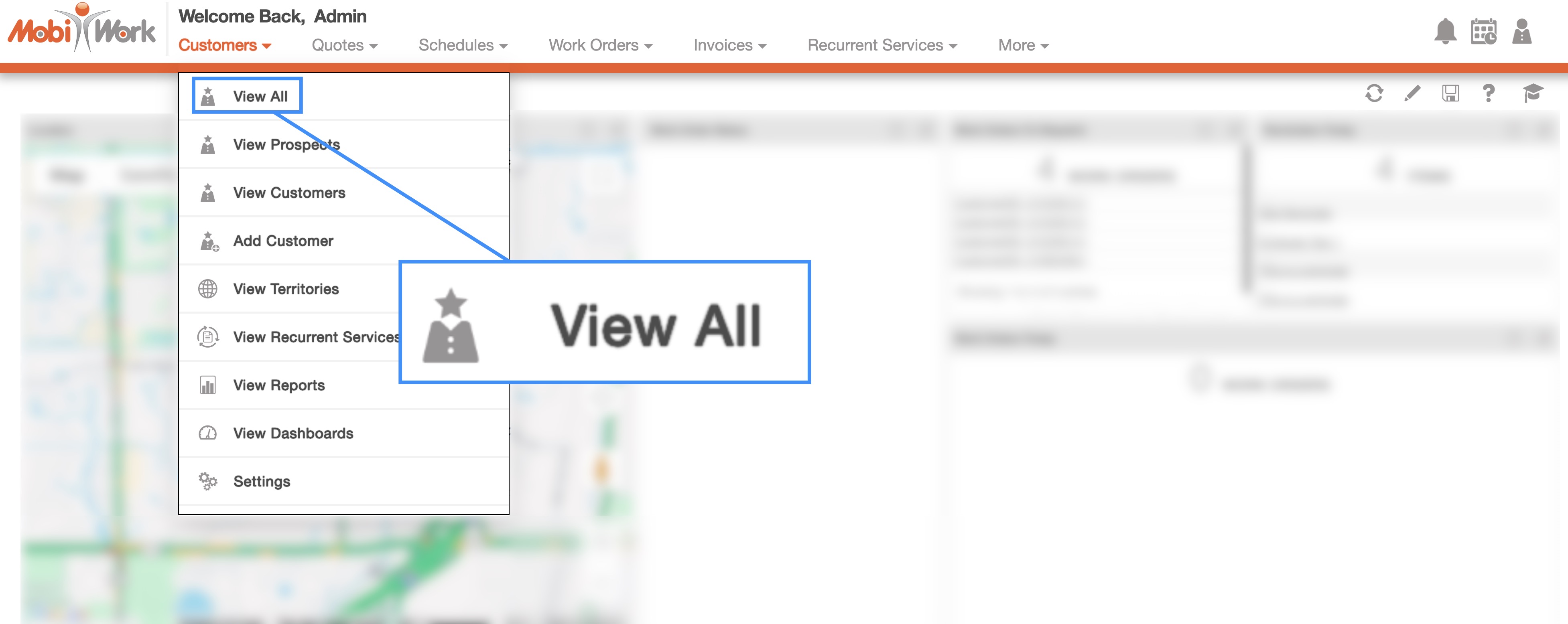 You can access the View All Customers page by hovering over the Customers feature from your MobiWork menu and clicking on the "View All" option: